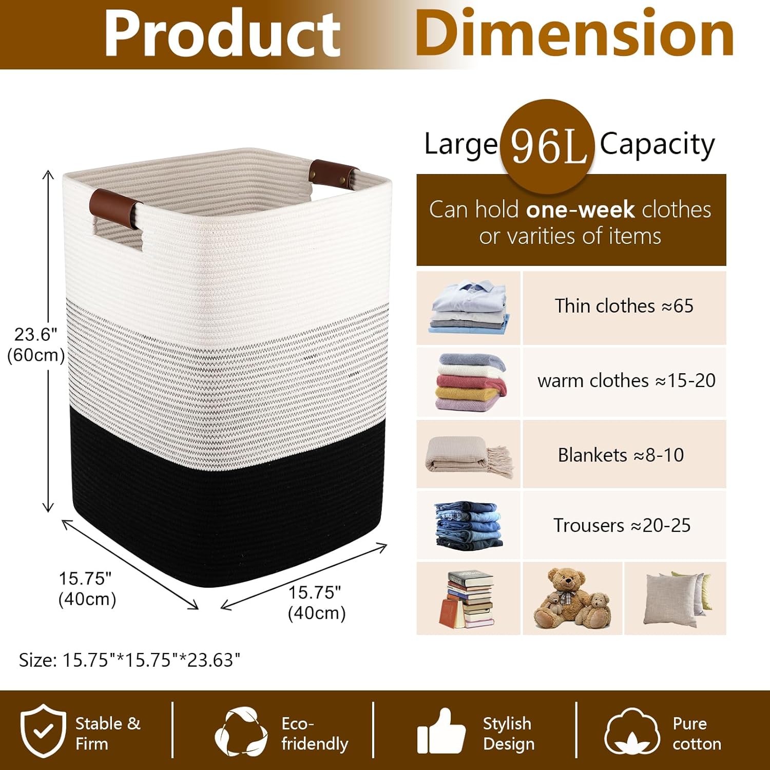 Laundry Hamper 96L Extra Large Laundry Basket, Woven Blanket Basket, Cotton Woven Storage Hamper with Handles for Living Room, Large Baskets for Pillows, Blankets, Clothes-Gradient Black