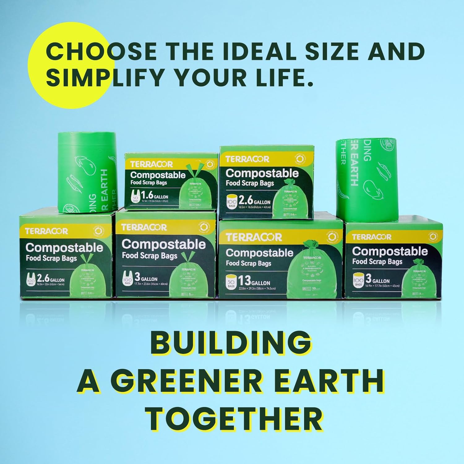 • More Responsible Choice:We all share the responsibility of saving the Earth. TERRACOR compostable bags are the ethical choice for a cleaner environment. Replace harmful plastic kitchen trash bags with compostable ones to reduce environmental waste.