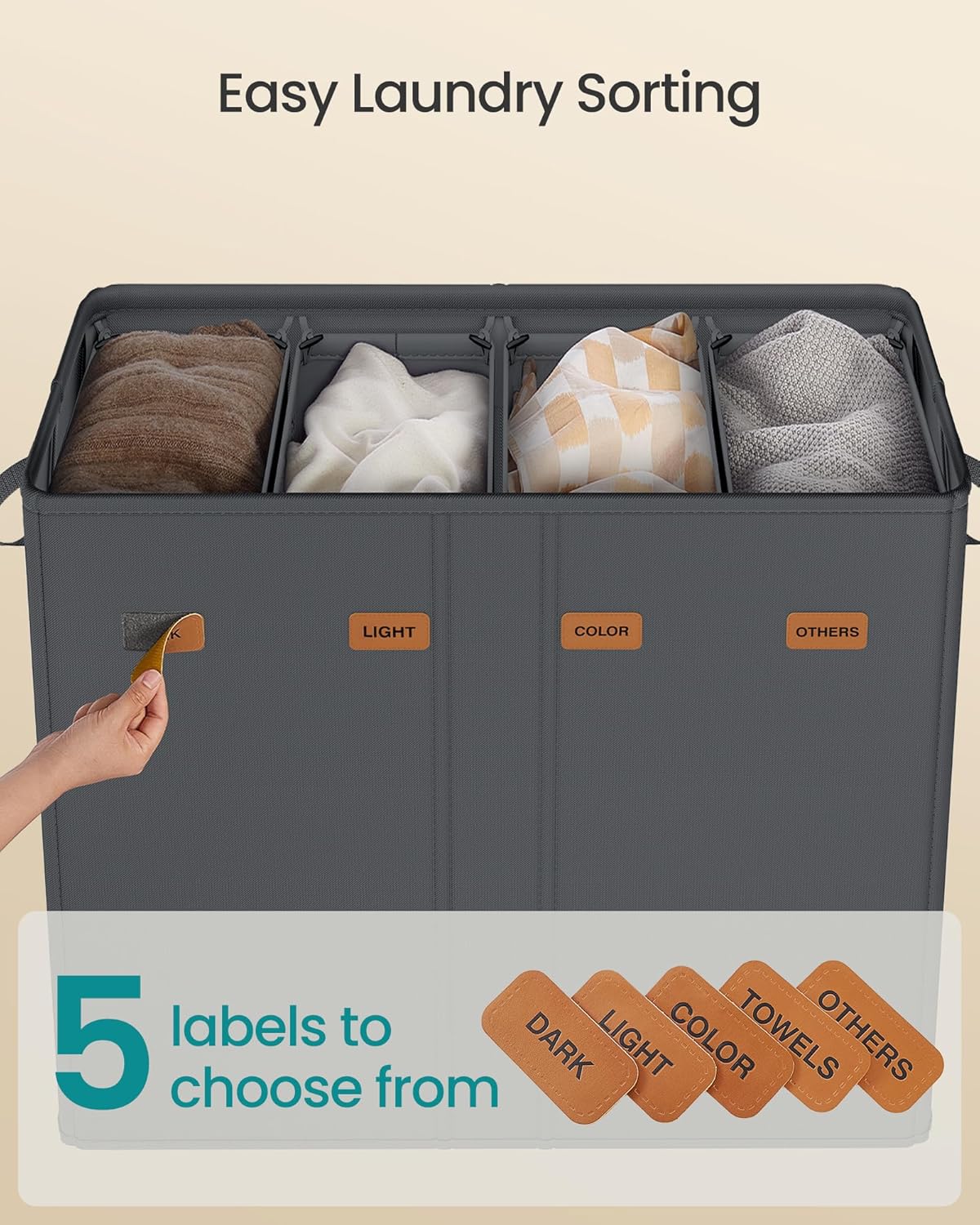 • 4 Compartments for Easy Sorting: Equipped with 5 labels (DARK, LIGHT, COLOR, TOWELS, OTHERS) and 4 compartments, this laundry basket makes it easy to sort your laundry, saving you time on laundry day