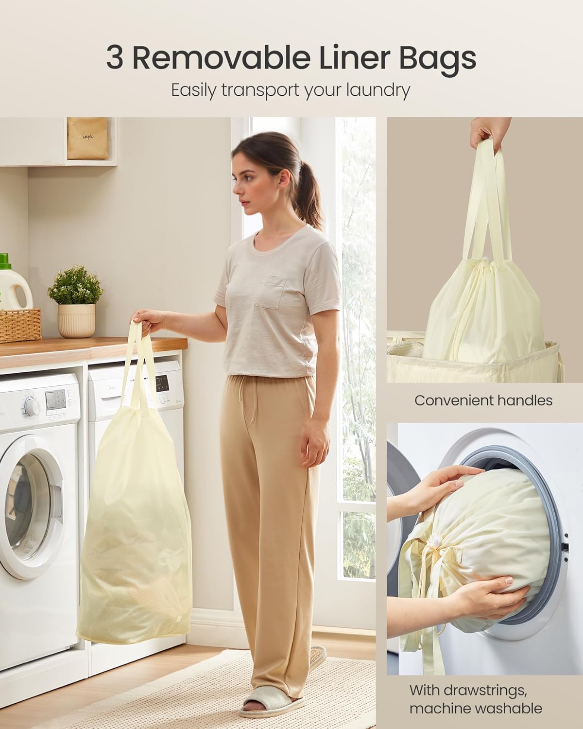 SONGMICS 42.2 Gallon (160 L) Laundry Hamper, 3-Compartment Laundry Basket Sorter with Lid, Labels, Removable Liner Bags, for Bedroom, Cream White URLH013W01
