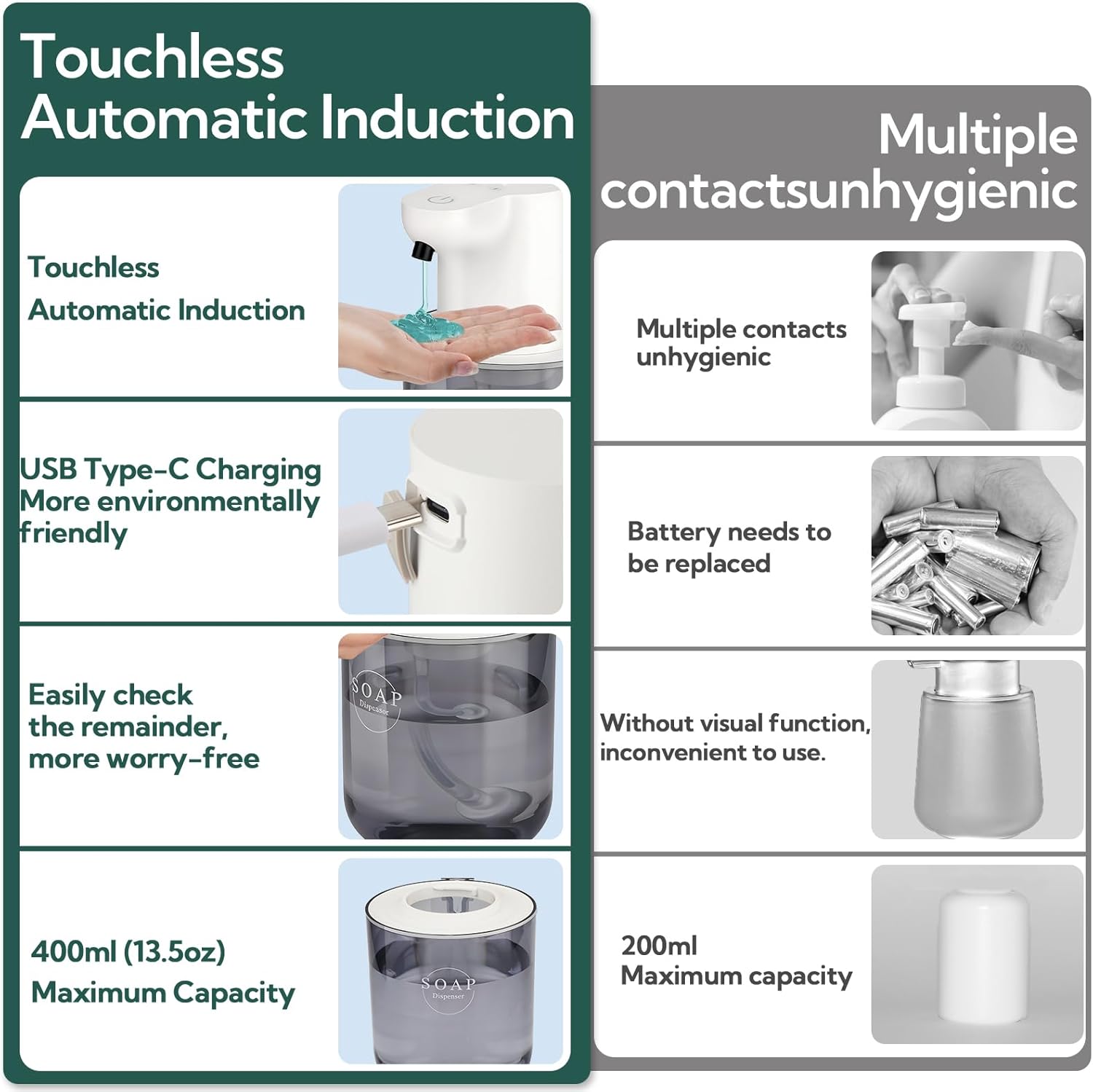 • 【Large Capacity & Long Battery Life】No more disposable batteries! Our foaming soap dispenser features a rechargeable battery, easily powered via USB. Enjoy up to 2-3 months of use on a single charge, depending on usage, for hassle-free, long-lasting performance.