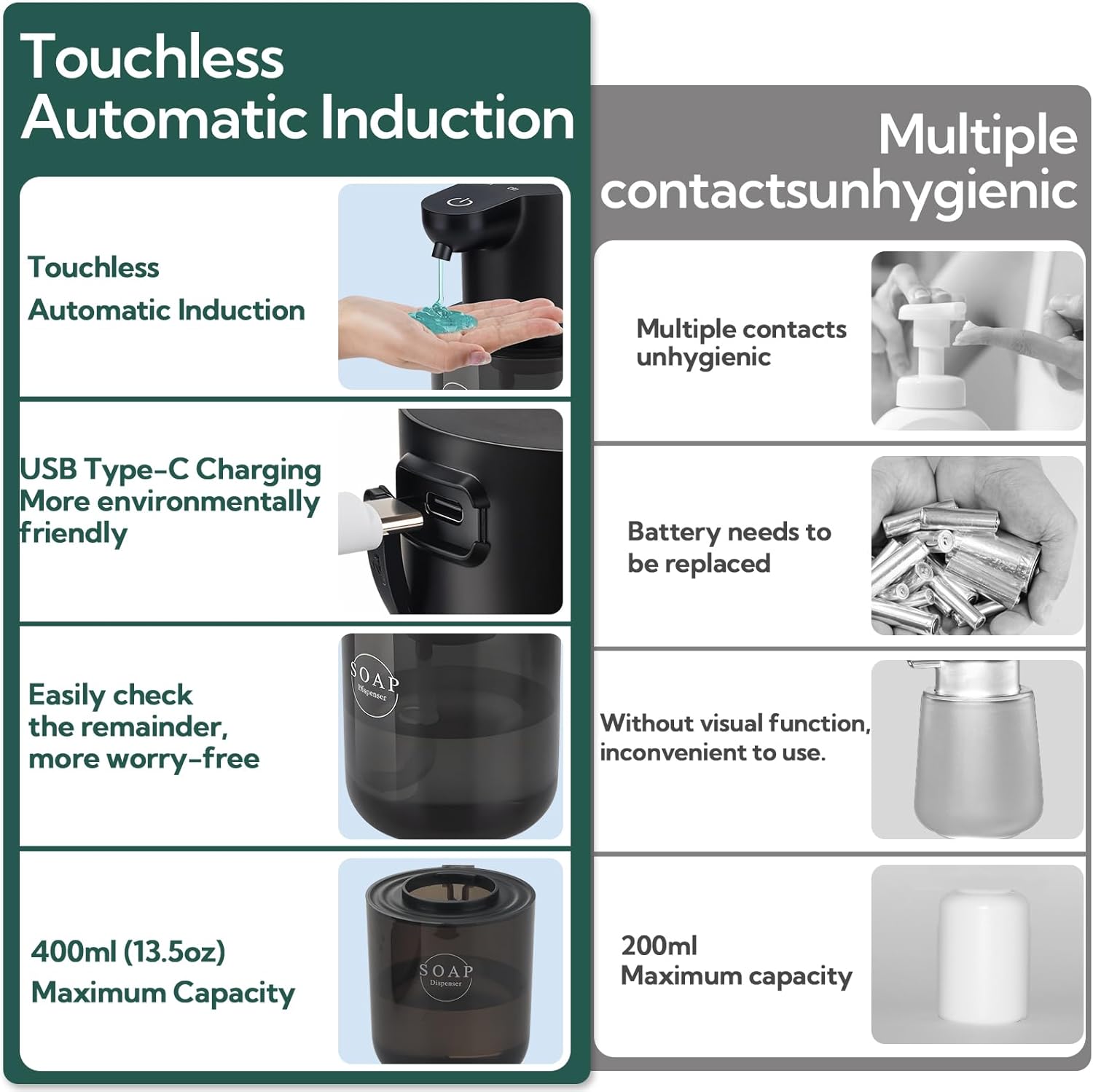 • 【Large Capacity & Long Battery Life】No more disposable batteries! Our foaming soap dispenser features a rechargeable battery, easily powered via USB. Enjoy up to 2-3 months of use on a single charge, depending on usage, for hassle-free, long-lasting performance.