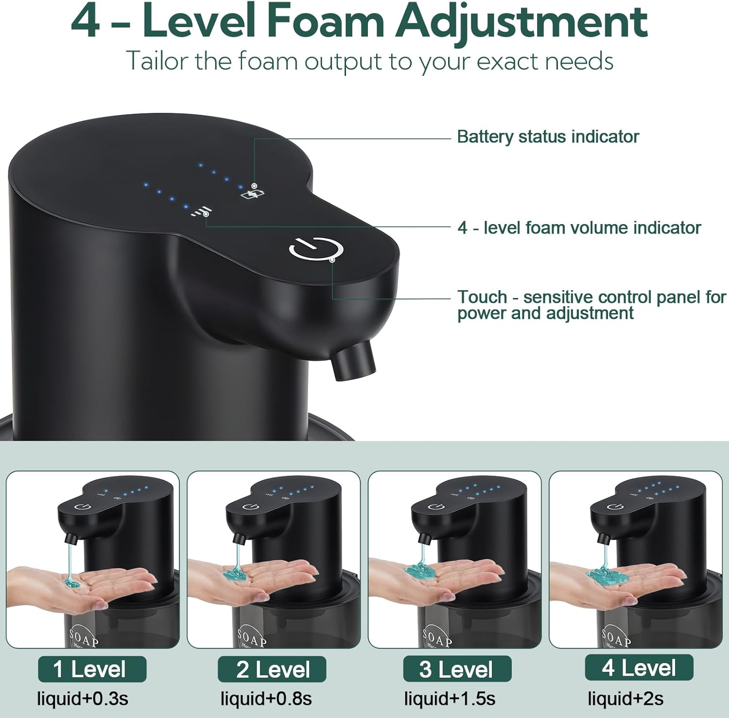 • 【4 Level Adjustable Soap Dispensing】This dispenser features 4 adjustable settings, allowing you to control the soap volume based on your preference. By simply pressing the power button, you can choose the dispensing duration (0.3s, 0.8s, 1.5s, or 2s) to ensure just the right amount of soap, helping to prevent waste.