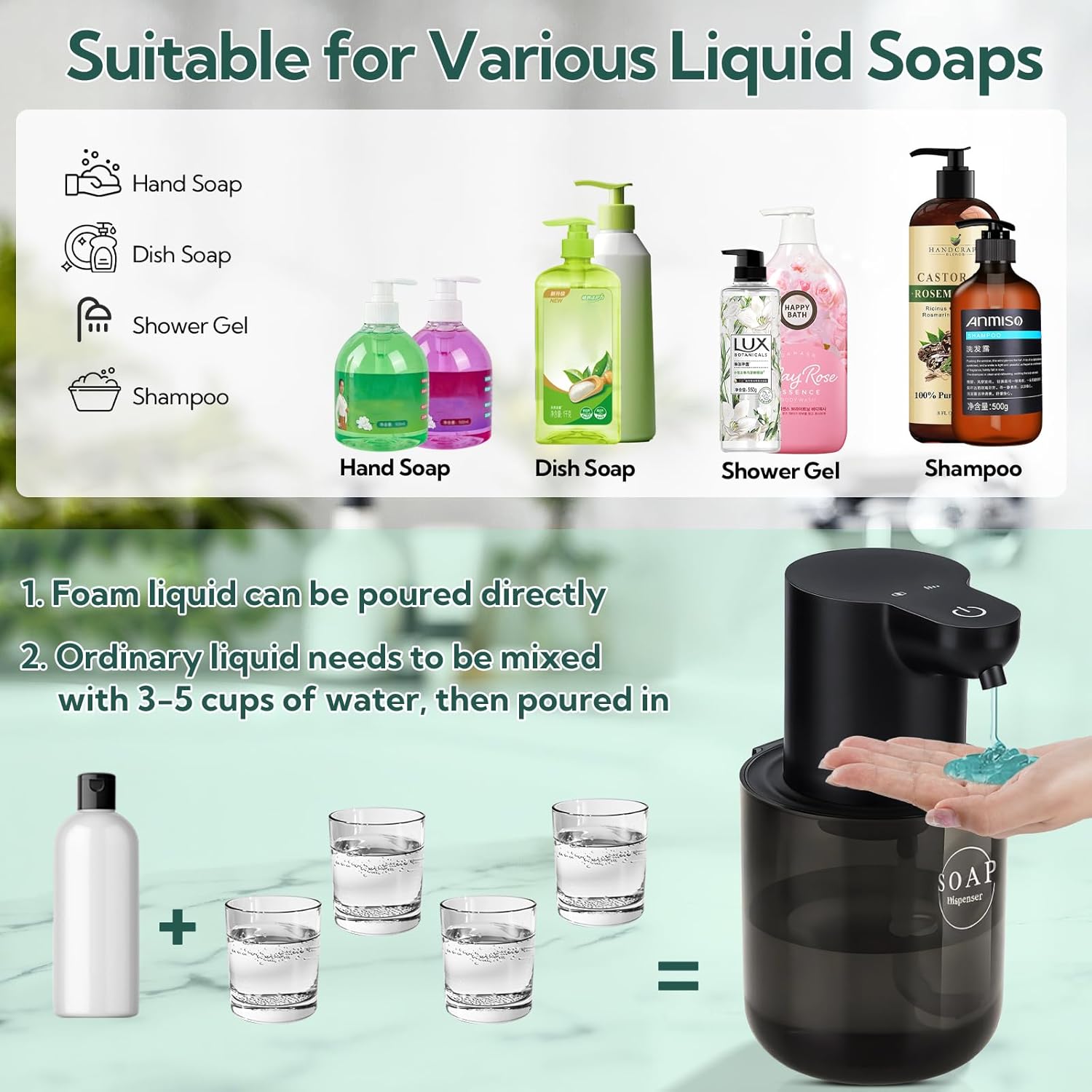 • 【Widely Use Soap Dispenser】This automatic soap dispenser works with dish soap, shower gel, shampoo, hand soap, and facial cleanser. It comes with 4 adhesive wall mounts, offering you the flexibility to either wall-mount it or place it directly on the countertop. Ideal for bathrooms, kitchens, offices, hospitals, hotels, homes, schools, and restaurants.