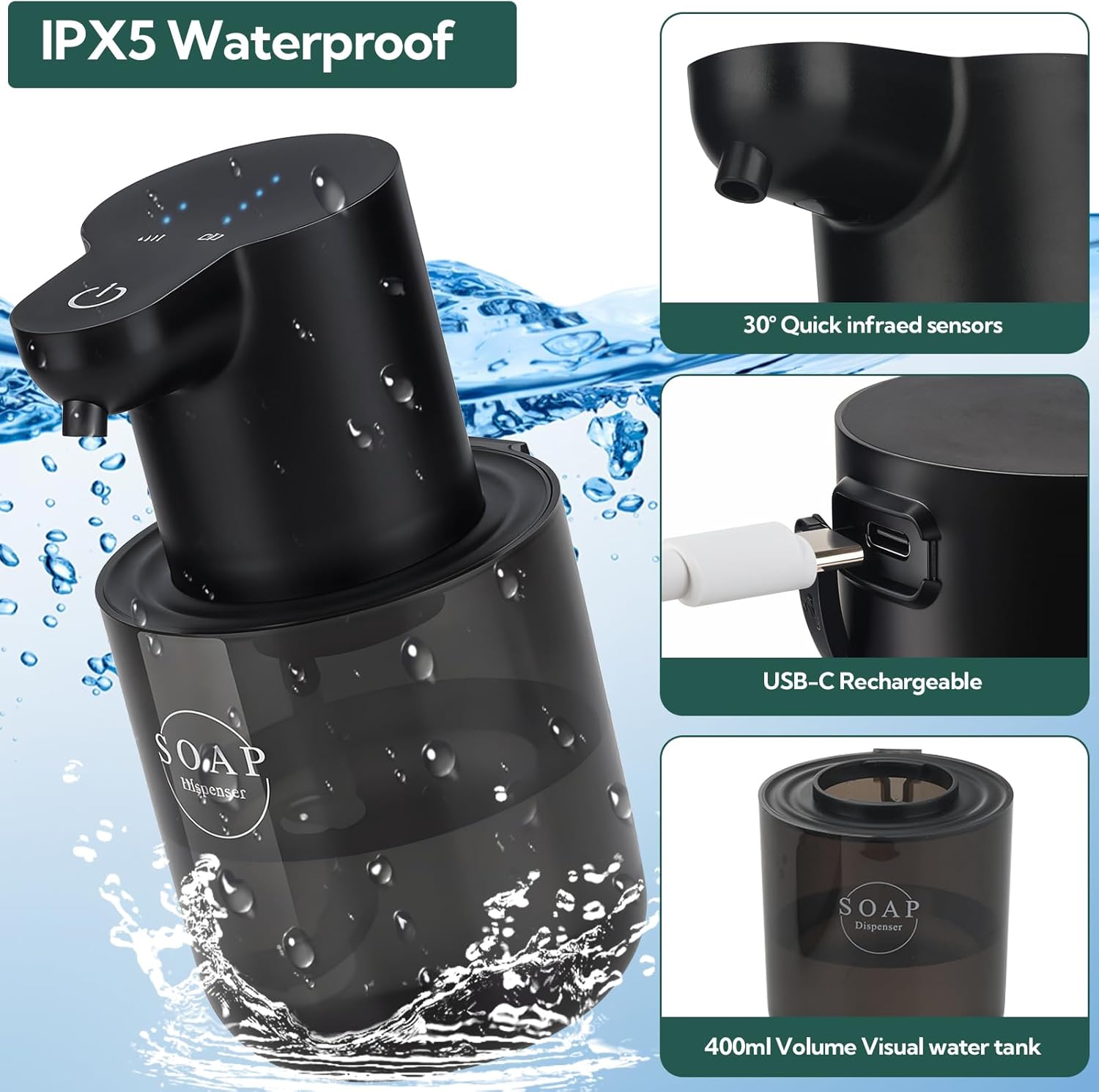 • 【IPX5 Waterproof & Leak-Proof Design】The IPX5 waterproof rating protects the dispenser from soap and water damage, while the rubber plug covering the USB charging port ensures leak-proof performance, making it reliable for use in wet environments like bathrooms and kitchens.