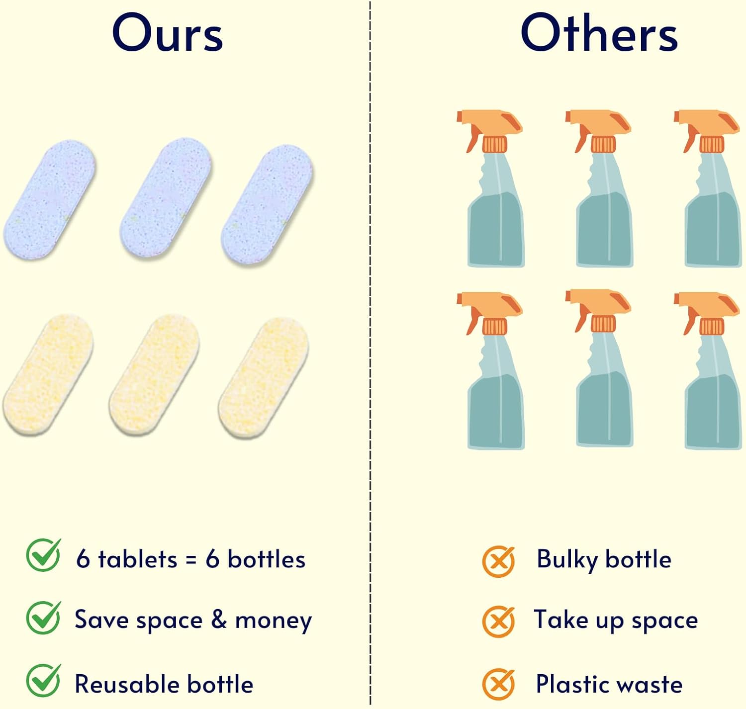 • WHAT YOU GET: 1 pack glass spray bottles and 6 Pack Multi-purpose cleaner tablets, can create 6 bottle of 16.9 oz cleaner and save plastic bottles from going into the landfill,thus you get a great all around sustainable cleaner. We do our best to our world as our companies mission and willingness.