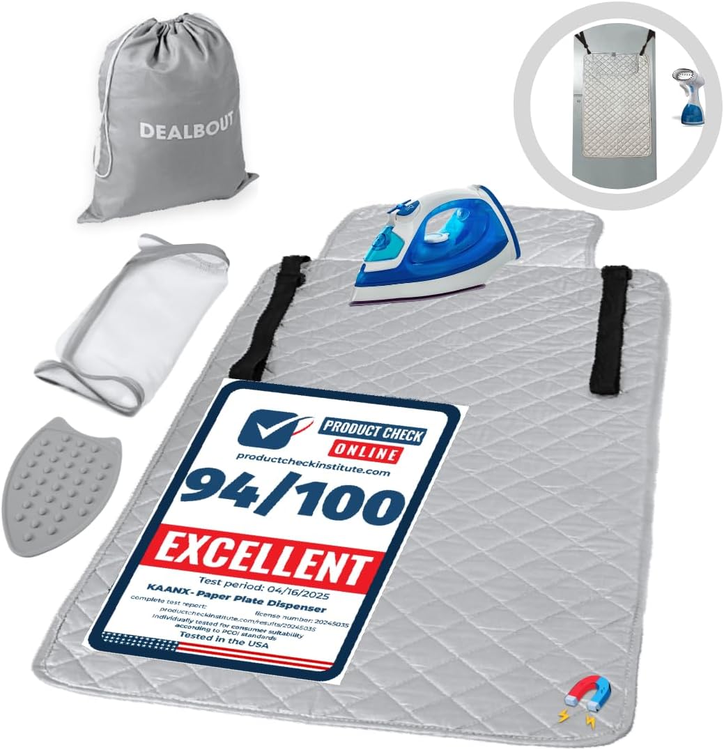 • โŒ›๐—ฆ๐—ฎ๐˜ƒ๐—ฒ ๐˜๐—ถ๐—บ๐—ฒ : Turn any flat surface into a convenient ironing pad This magnet heat resistant foldable iron padding mat is designed for quick hassle free touch ups on countertops washers dryers tabletops and dorm rooms Its quilted non slip backing ensures stability while the insulated cover protects fabrics and surfaces from heat and moisture Lightweight and compact it folds or rolls up easily into the included drawstring bag for organized storage Perfect for small spaces RVs laundry rooms and daily use no bulky wall ironing board full size needed