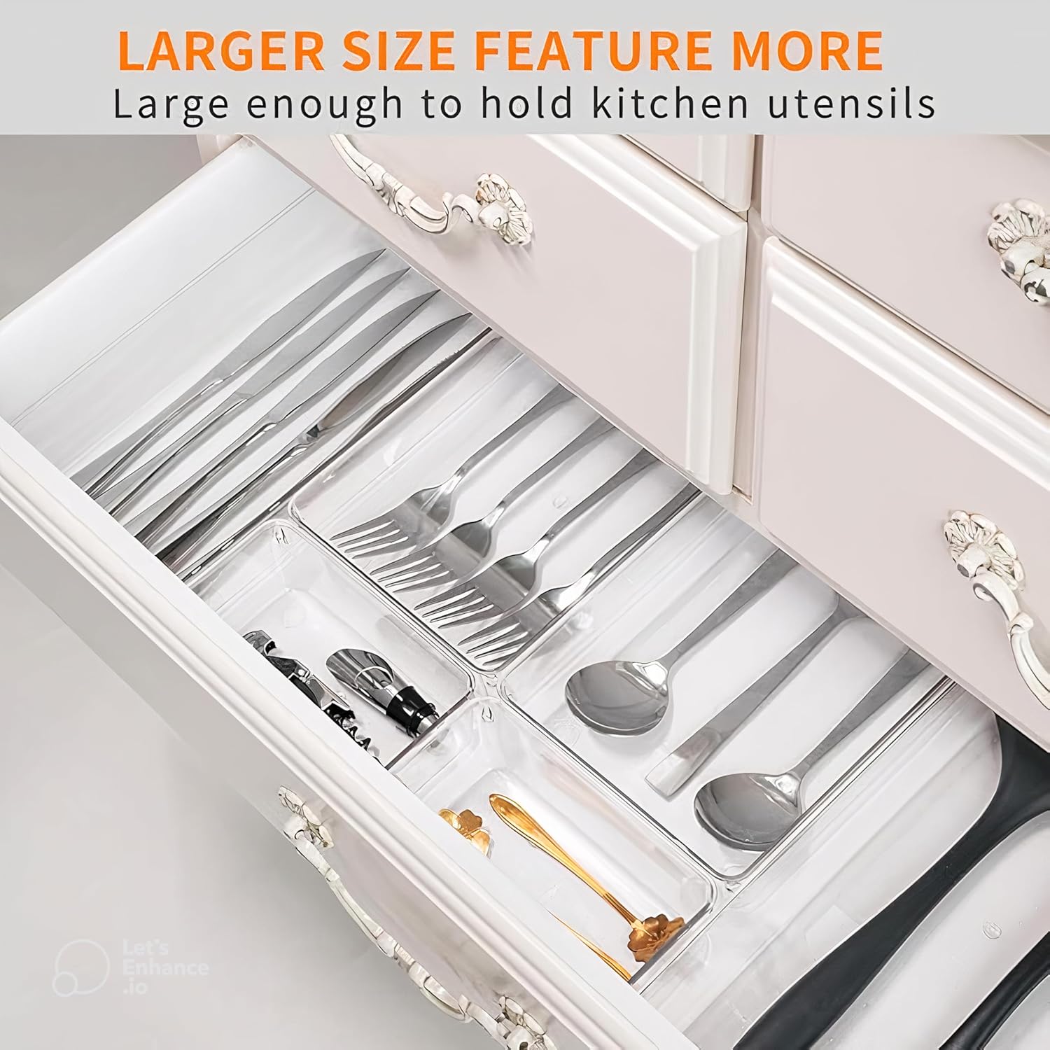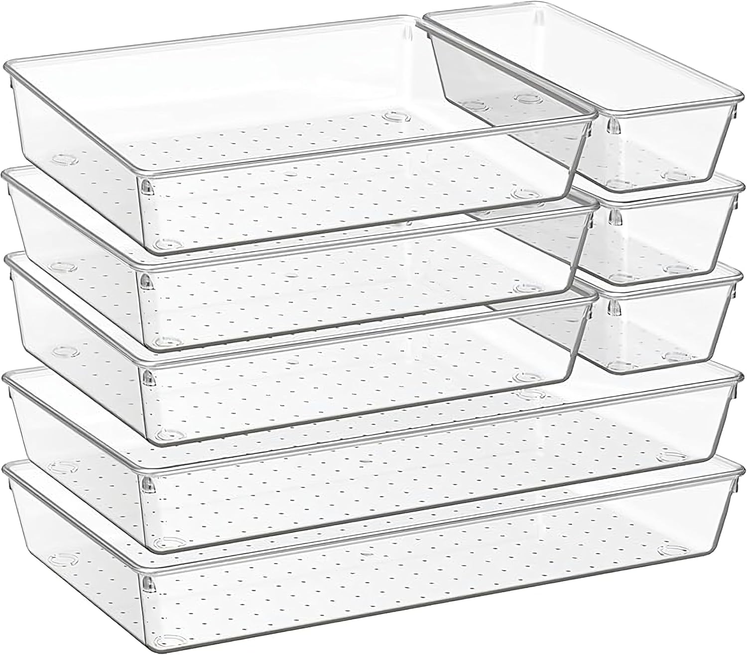 8-Pack Clear Plastic Drawer Organizer Trays – Large Dividers for Kitchen Gadgets, Bathroom Storage, Makeup & Vanity Accessories – Multi-Use Home Essentials for Organized Living
