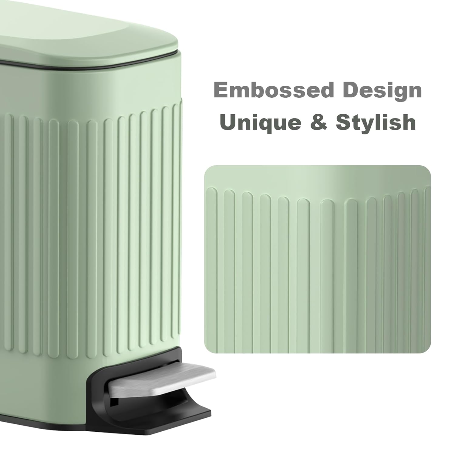 • Embossed Metal Finish: The small garbage can is made of thickened grade stainless steel. The unique embossed design makes the garbage can have a retro and elegant appearance, which is attractive and decorative while being practical