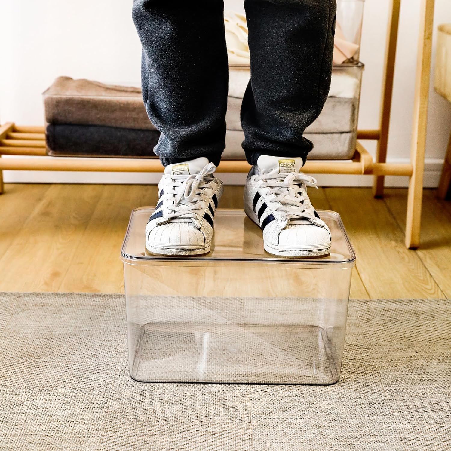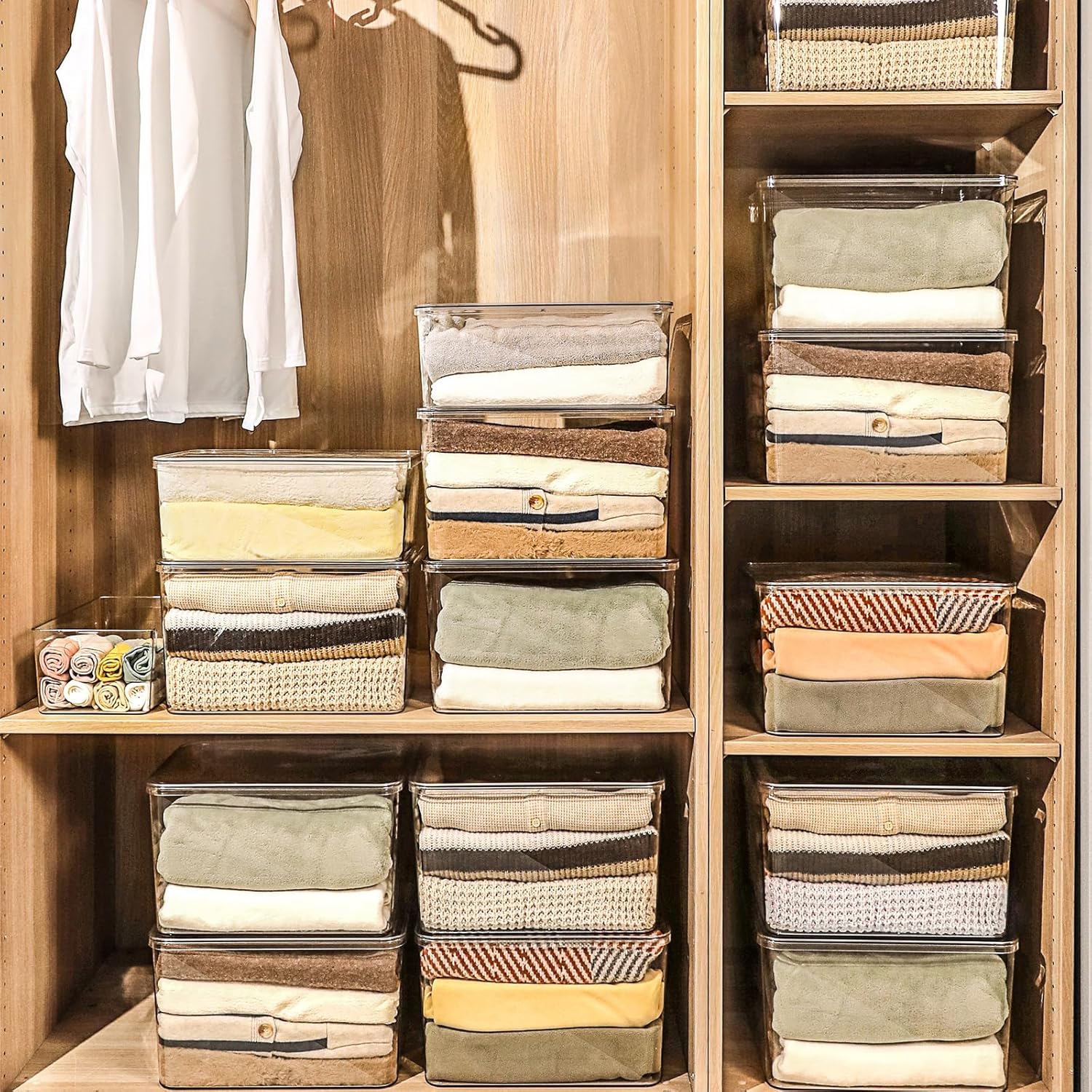 • 4. These large storage boxes with lids are perfect for sorting and storing clothes, food, shoes, toys, books, scarves, and more. Providing dust protection, the stackable design will fully utilize your closet or other space.