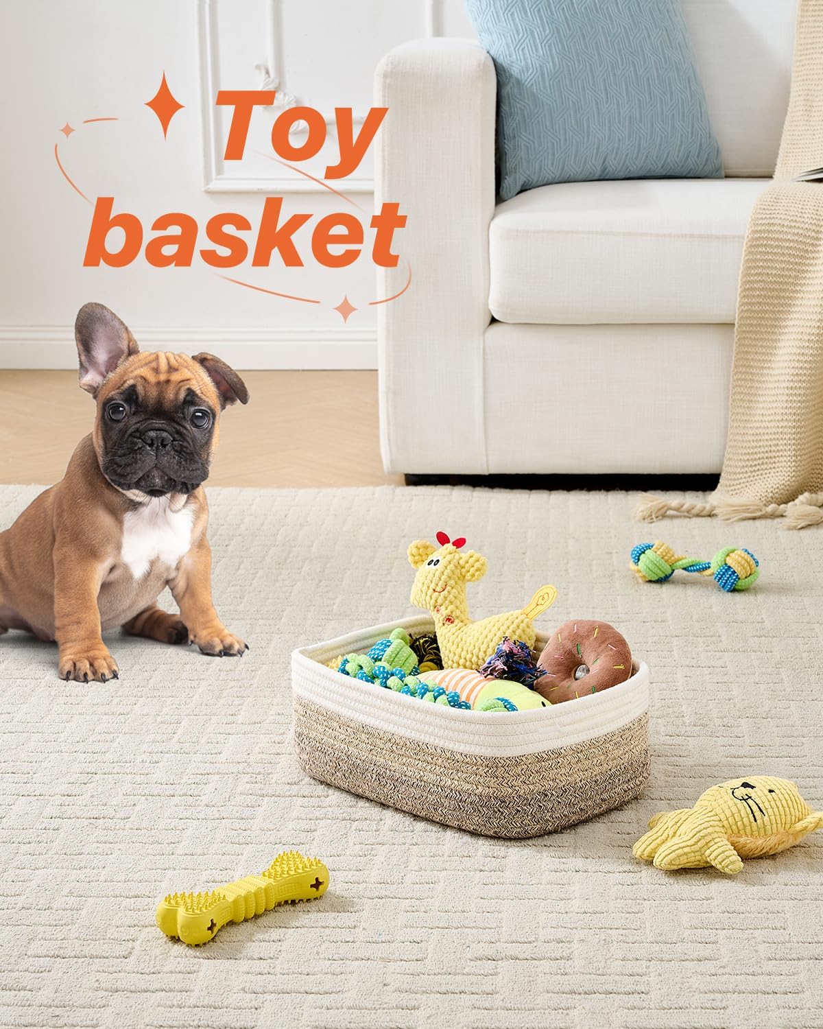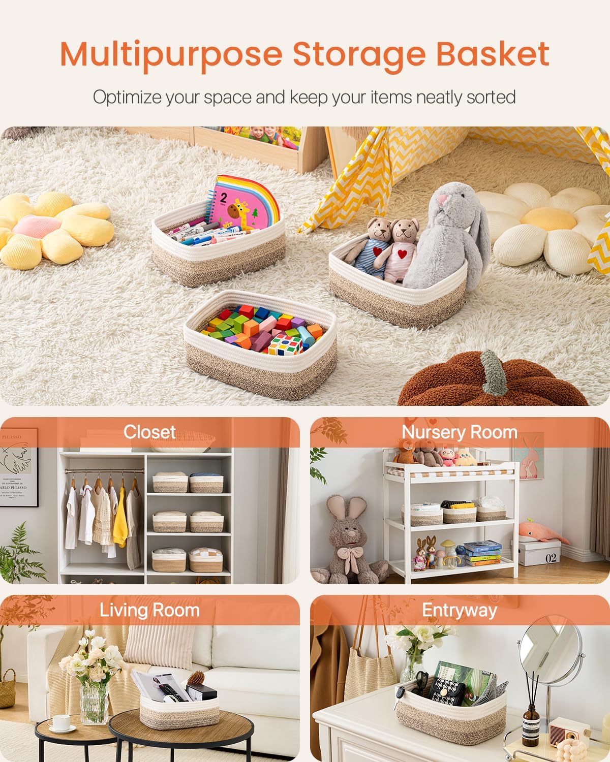 • [ Safe & Durable ] Our small woven basket is made of 100% natural cotton rope that is sturdy yet soft to touch, odor free, free of harsh chemicals, no hard edges that protect your precious furniture and flooring from scratches. So, it's a reassuring choice for families with babies and pets. We use high-quality ropes and hand-woven by skilled artisans to ensure the quality of our cotton rope baskets, tightly constructed and long-lasting