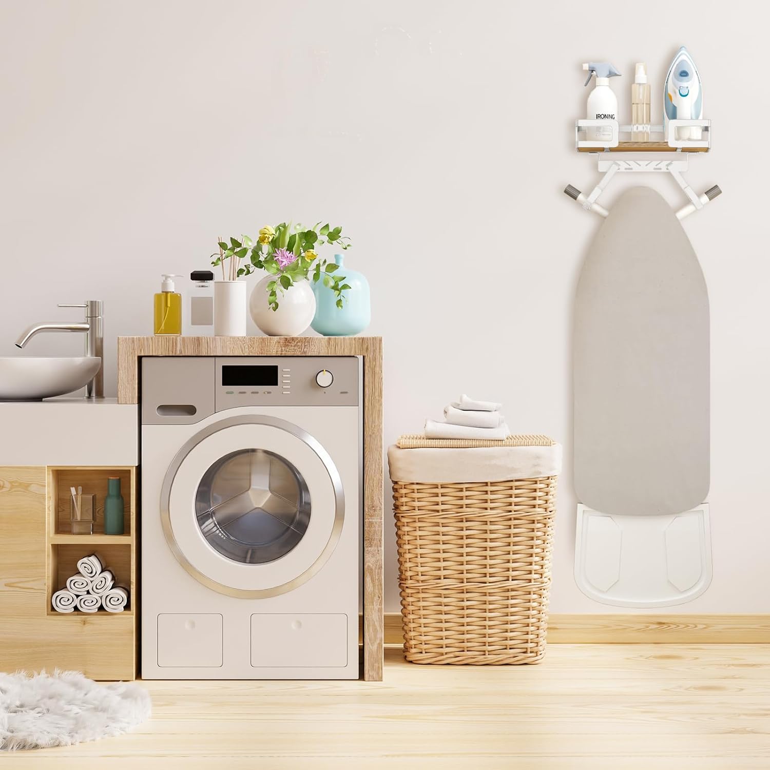 • WIDENED FRAME IS MORE STRONG: The laundry room accessories white ironing board are made of iron and natural wood. The wider frame makes it more sturdy and durable with 2 wider hooks. It creates a rustic and modern style while keeping your storage items safe.