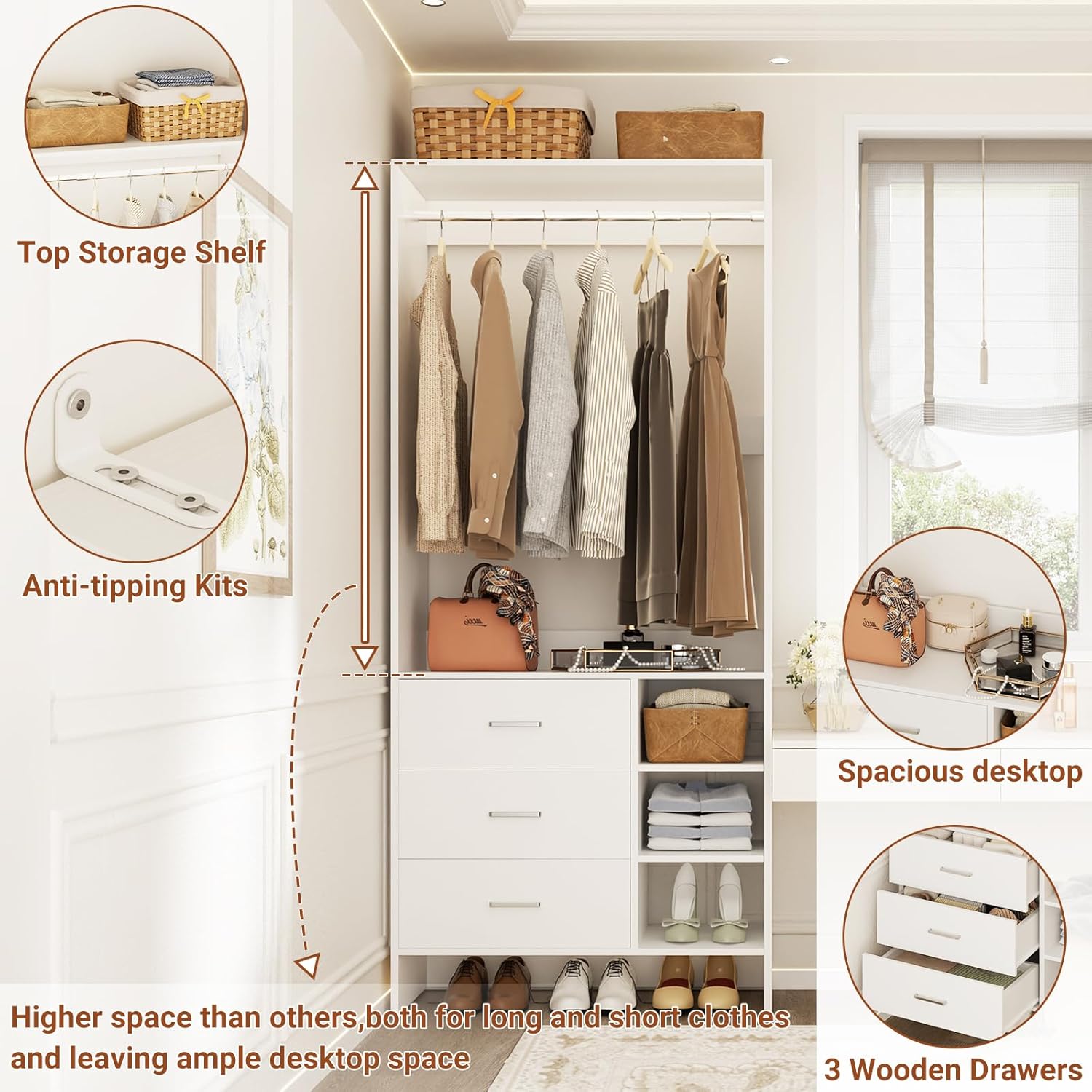 • 【Wood Closet System with 3 Drawers】 This closet system comes with 3 durable wooden drawers, unlike those flimsy fabric ones that tear easily and are hard to clean. Perfect for storing your personal items, like underwear, socks, or even T-shirts. There are 3 open shelves, you can store bags, shoes. Plus, the design gives you extra vertical hanging space for both long and short clothes, along with a spacious top surface for even more storage