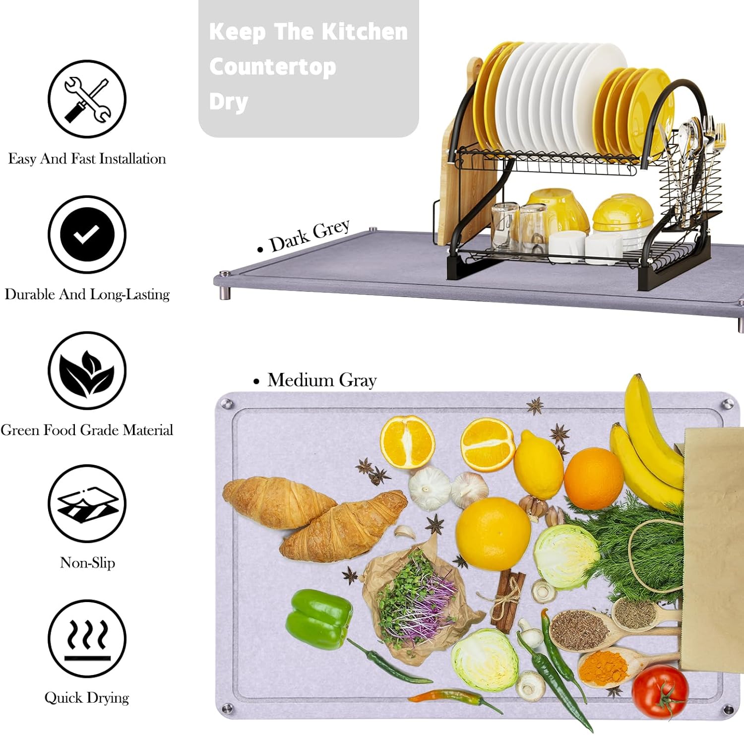 Large Diatomaceous Earth Stone Dish Drying Mats for Kitchen Counter,24"×16",Quick Drying,with 4 Non-Slip Stainless Steel Feet, Suitable for Various Countertops, Bowl Racks, Medium Gray