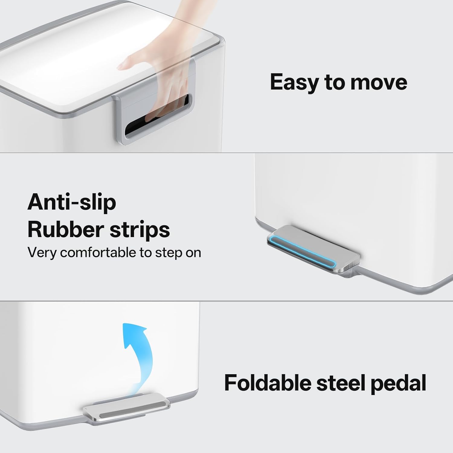 • Dwsign benefits: Garbage can with lid stays open, removable inner bucket, collapsable foot pedal and carrying handle, etc.