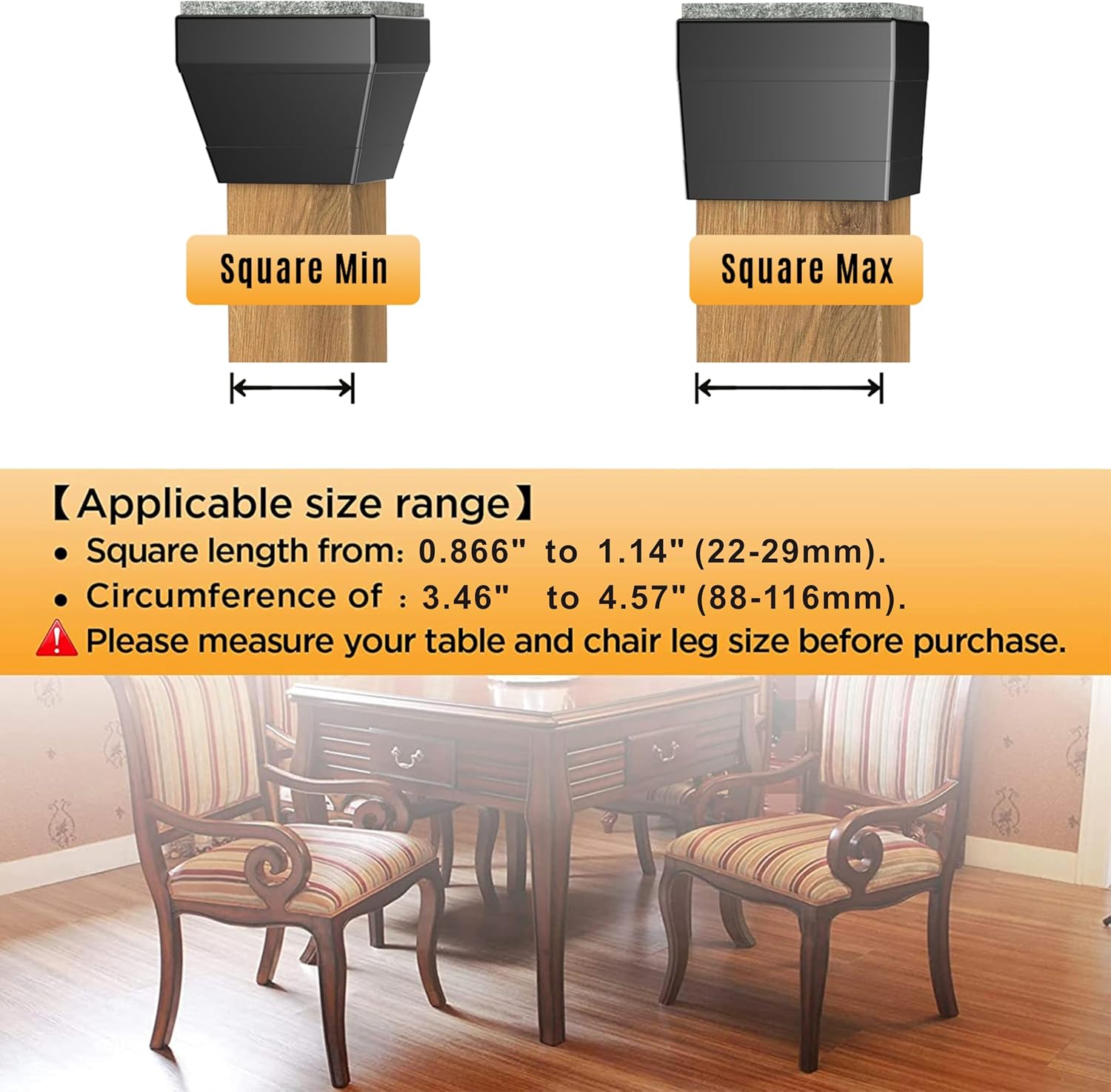 • Universal Fit: Suitable for chair legs with perimeter of 3.46" to 4.57" (88-116mm). Square length 0.866" to 1.14" (22-29mm). Please measure the diameter of your furniture legs before purchasing. Our chair leg caps are suitable for square furniture foot , such as restaurant chairs, bar stools, patio chairs, kitchen chairs, storage cabinet, metal bistro chairs etcchair etc.