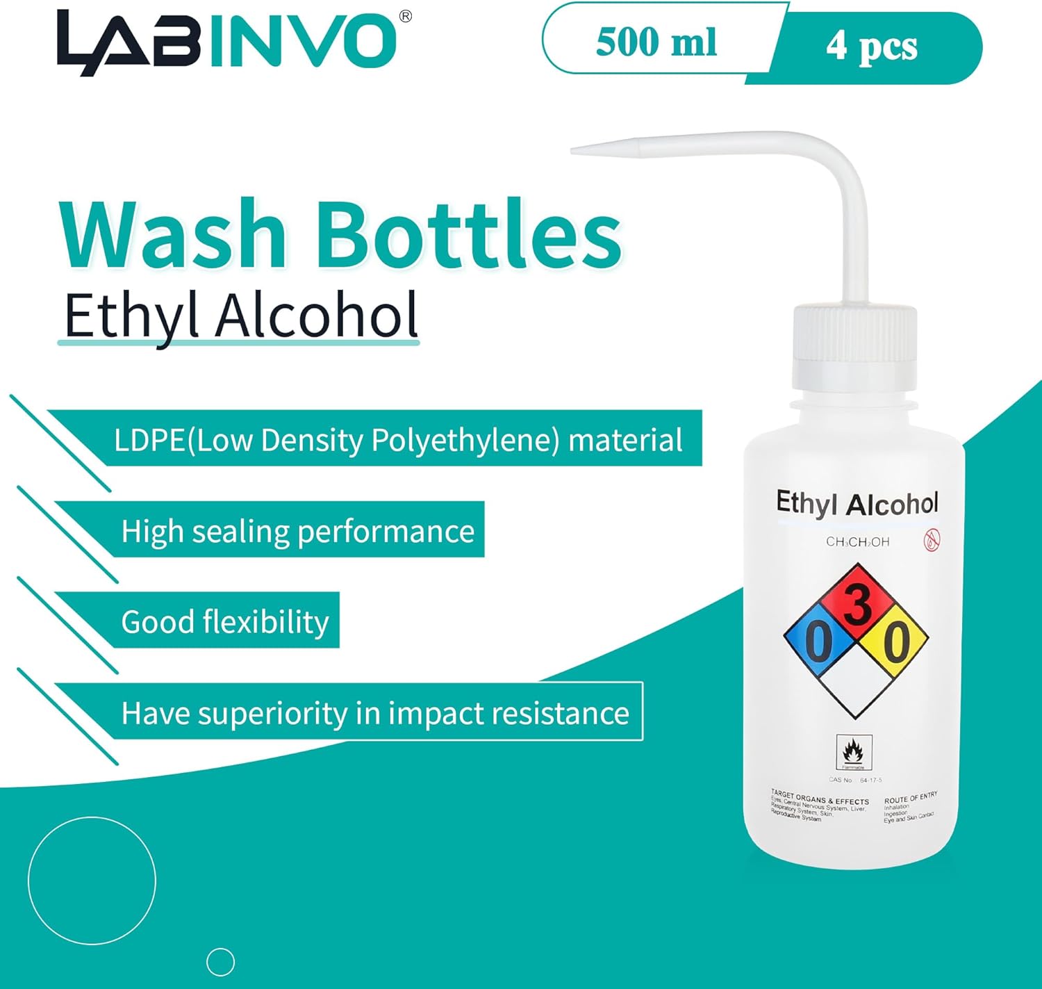 4PCS of Ethyl Alcohol Wash Bottles, Vol.500ml (17oz), Narrow Mouth, Self-Venting Safety Wash Bottle, LDPE Material, IN-WBE500
