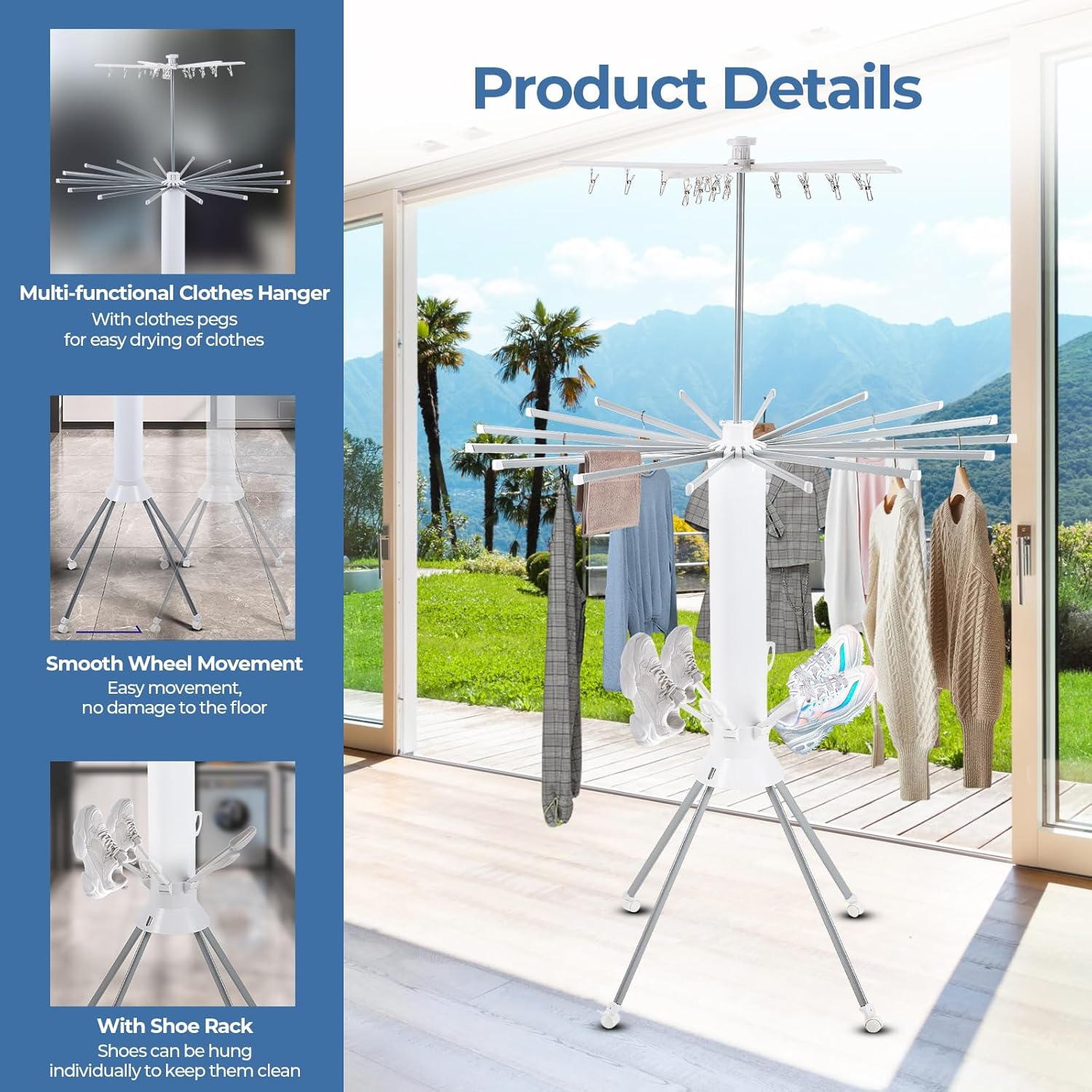 • 【Mobility and Safety Features】Equipped with four movable casters and a foot brake system, this portable clothes drying rack can be easily moved and secured in place. Ground stakes add additional stability, ensuring the drying rack remains safe during unexpected gusts of wind.
