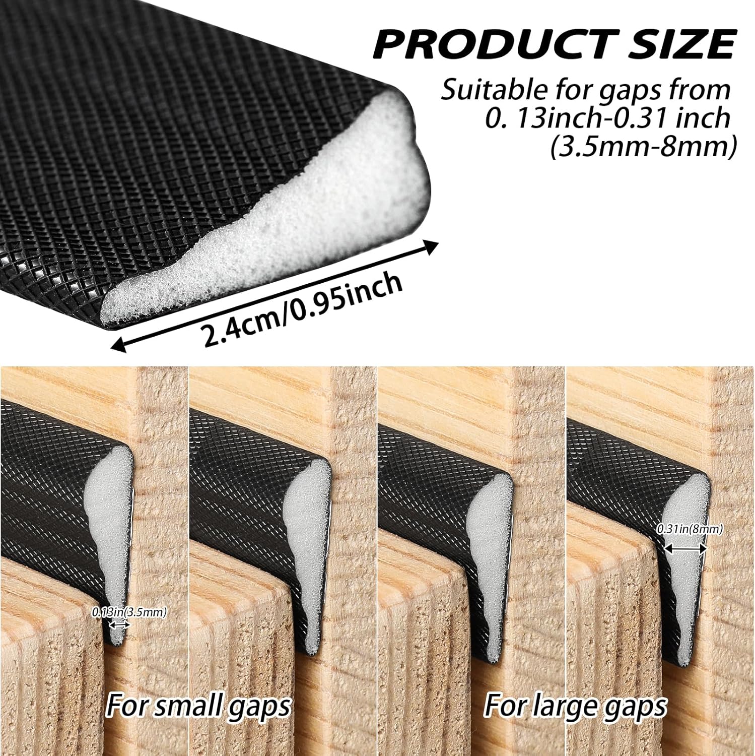 • Adaptable Design: The unique wedge-shape, with a wide edge of 9.5mm (0.38 inches) and a narrow edge of 2.5mm (0.1 inches), allows it to fit snugly into gaps ranging from 3.5mm to 8mm (0.13-0.31 inches). This flexibility ensures a perfect seal for any door or window frame