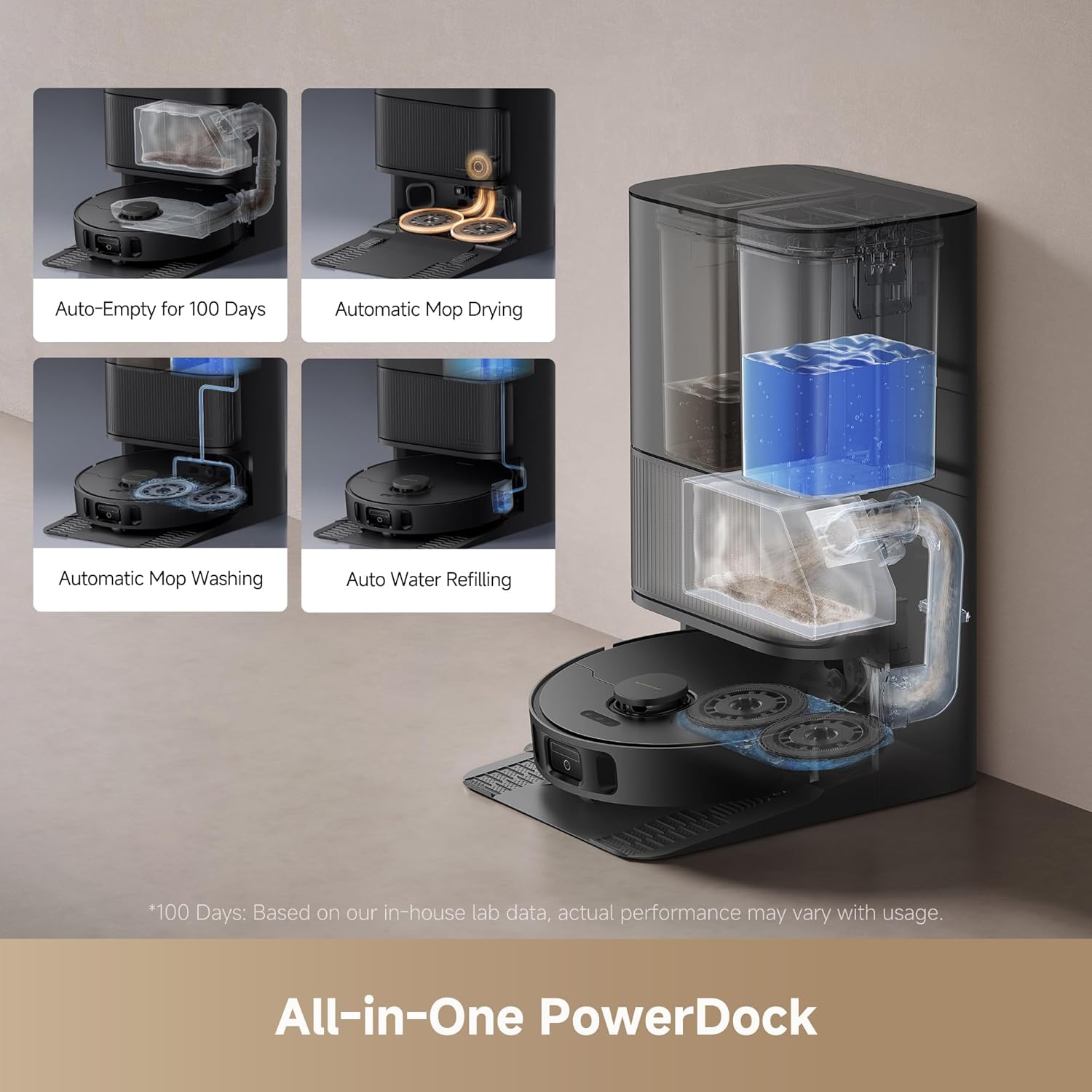 • All-in-One Self-Emptying Base: The robot vacuum self emptying PowerDock station automates maintenance by refilling water, washing mopping pads, and providing hot air drying. As a self-emptying robot vacuum, it holds up to 100 days of dust, offering a truly hands-free cleaning experience.