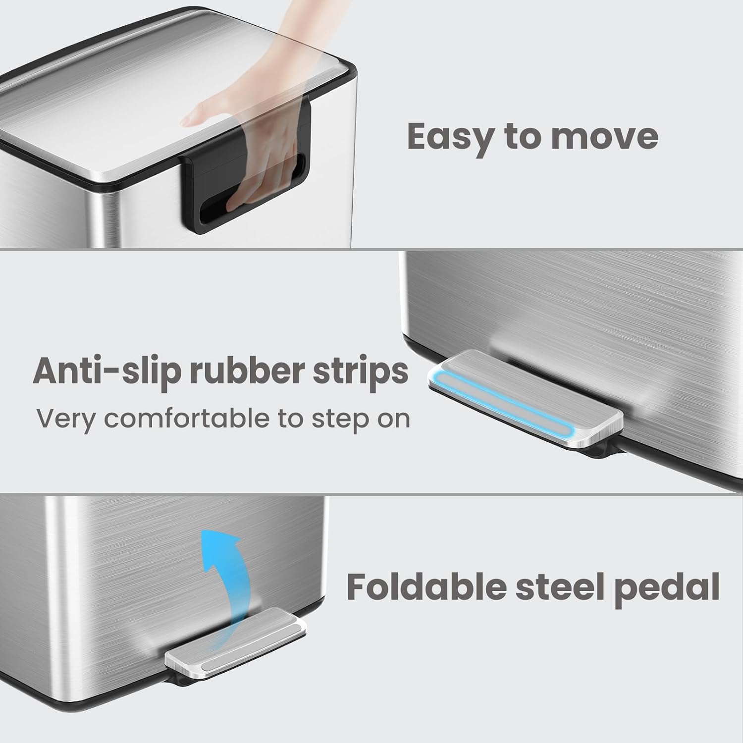• Sturdy: The rectangle trash can has stainless steel, anti-fingerprint exterior and PP plastic inner bucket for reliable strength.
