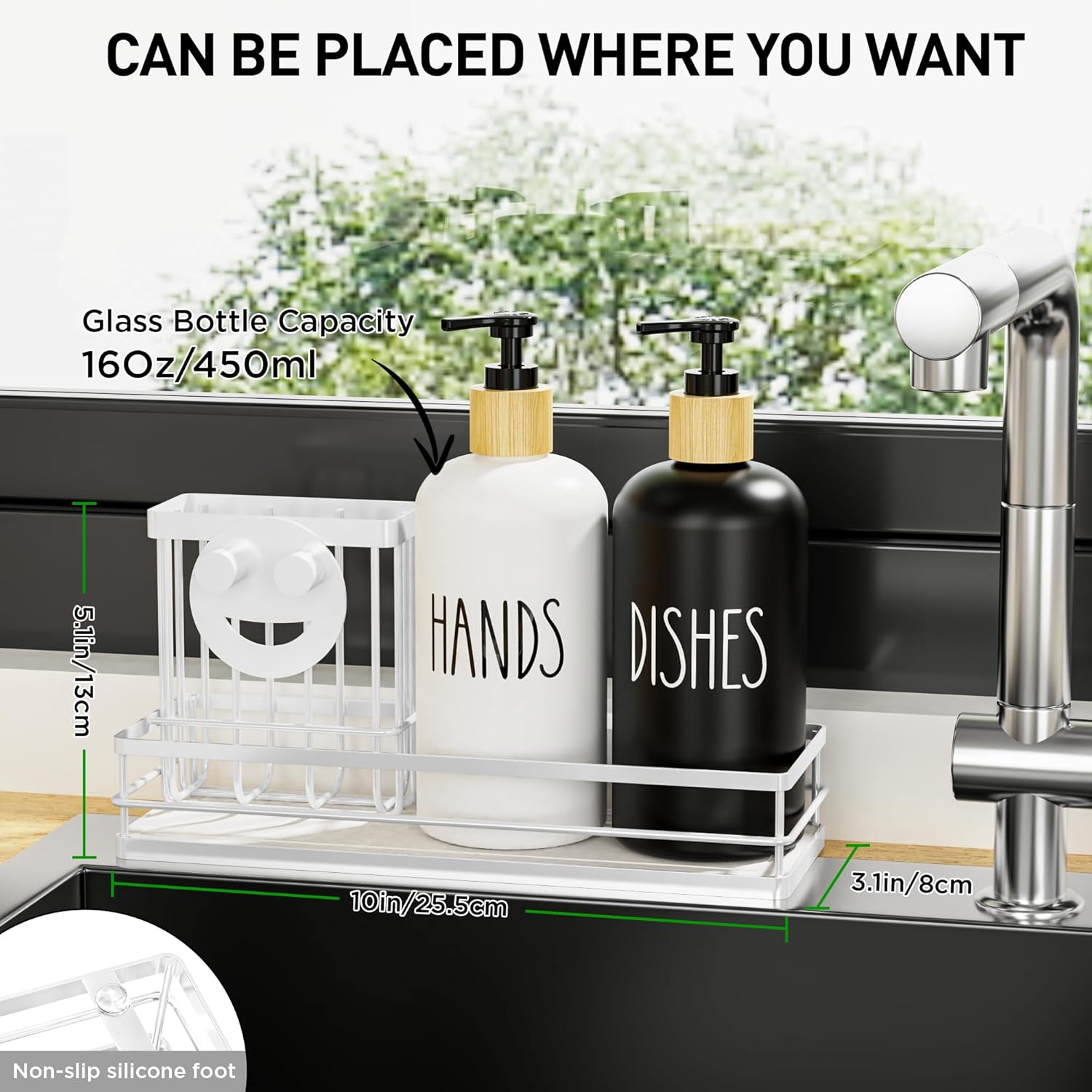 Moforoco Kitchen Dish Soap Dispenser Set, 16OZ Glass Bottle, Hand and Dish Soap Dispenser Set, Instant Dry Tray, Non-Slip Silicone Pad, Brush Holder with Smiley Face Sponge Holder, Kitchen Decor
