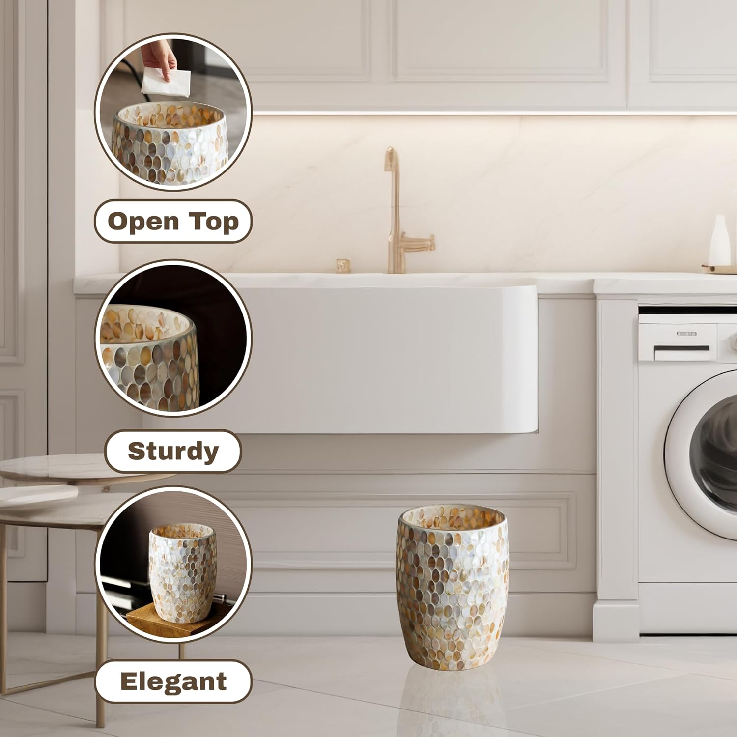 • Premium Small Garbage Can Seashells - Our decorative bathroom trash cans are hand-made with a beautiful mosaic glass finish for various-themed bathroom decor. A must-have in your new house essentials for a luxurious bathroom experience.
