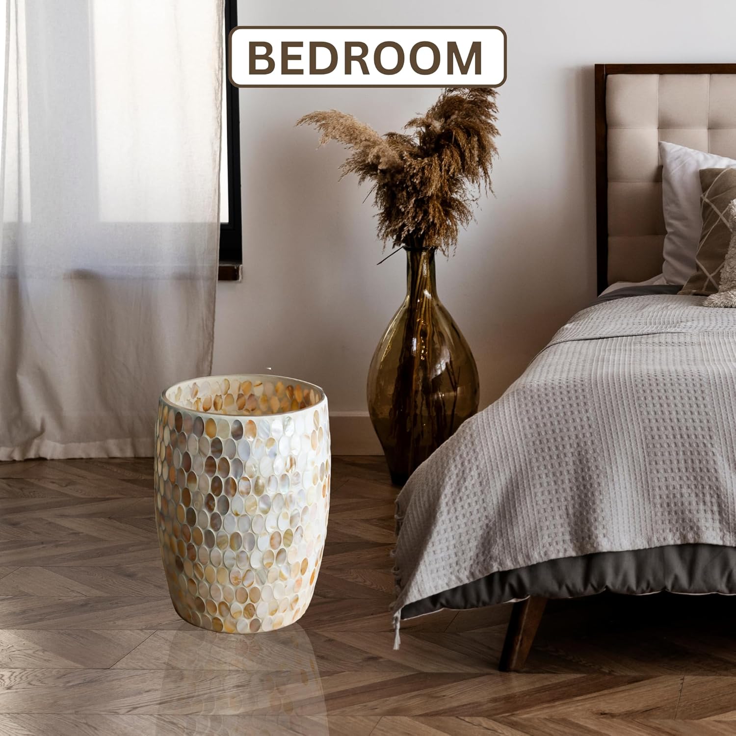 Escenzy Natural Shell Bathroom Trash Can Mosaic Glass 5L | Decorative Small Garbage Can | 7" x 10" | Luxury Waste Basket for Restroom, Office, Bedroom & Kitchen | Shiny Glass Bathroom Accessories