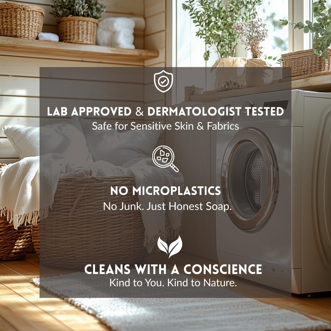 • ✔ HYPOALLERGENIC & GENTLE ON SKIN Made with hypoallergenic ground bar soap and no harsh chemicals — safe for sensitive skin and delicate fabrics.