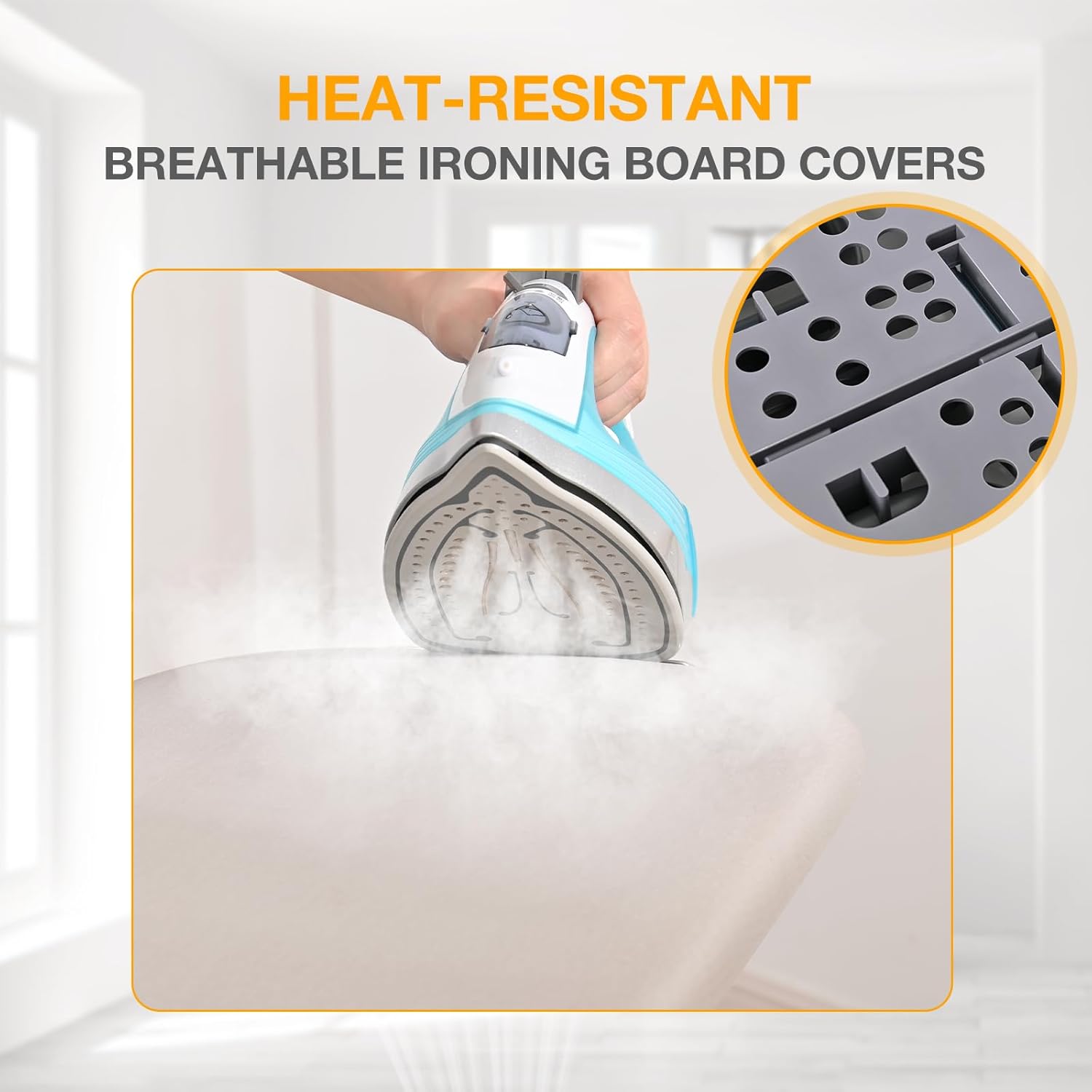 • Professional-Grade Performance: Our Ironing boards with strong mesh top,it can allows for even heat distribution, 100% cotton cover resistant to high temperatures, preventing clothes from sticking,achieve professional-grade ironing results