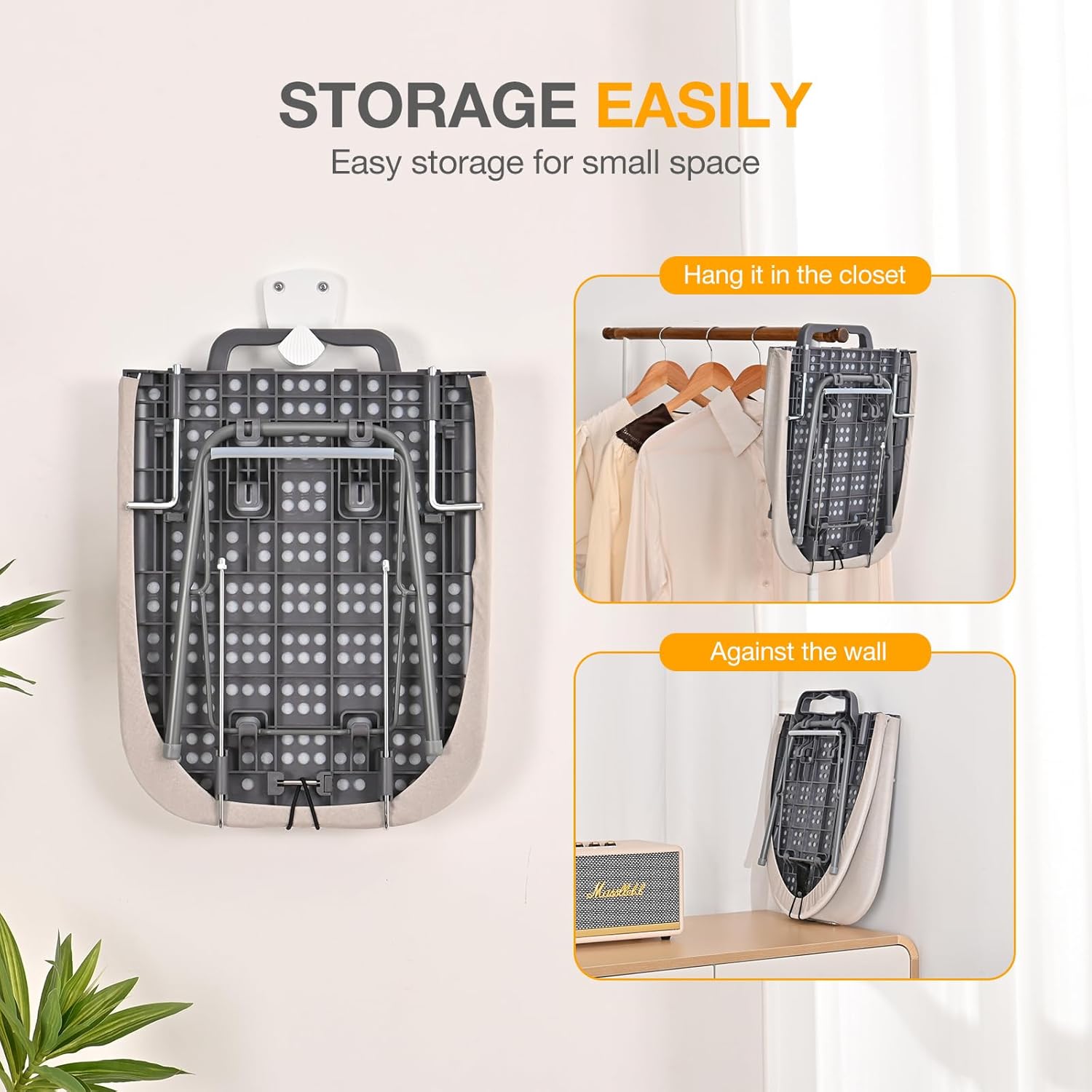 • Amazing Space-Saving: Space-saving compact iron board with its own hanging hook, easily hangs over any standard door, also can storage in a closet, against a wall, even can under couch or bed. Handle design is easy to carry wherever you needed