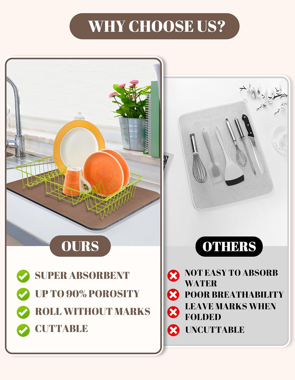 • Super Absorbent: Dish Drying Pad is made of super absorbent nano, the drying pad is soft and highly absorbent, which can dry quickly. In addition, the drying mat is thick enough to better protect countertops, tableware, and glassware from damage and contamination.