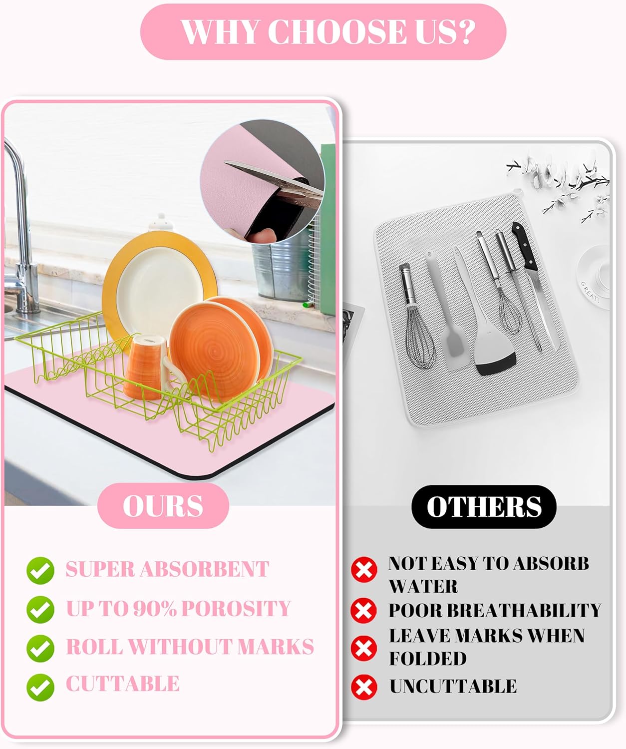 • Dish Drying Mat: Each kitchen counter mat measures 16 x 24 inches, which is larger than ordinary draining mats and can hold large pots, pans, and more dishes. Dishmats are perfect for kitchen counters and bathroom countertops.
