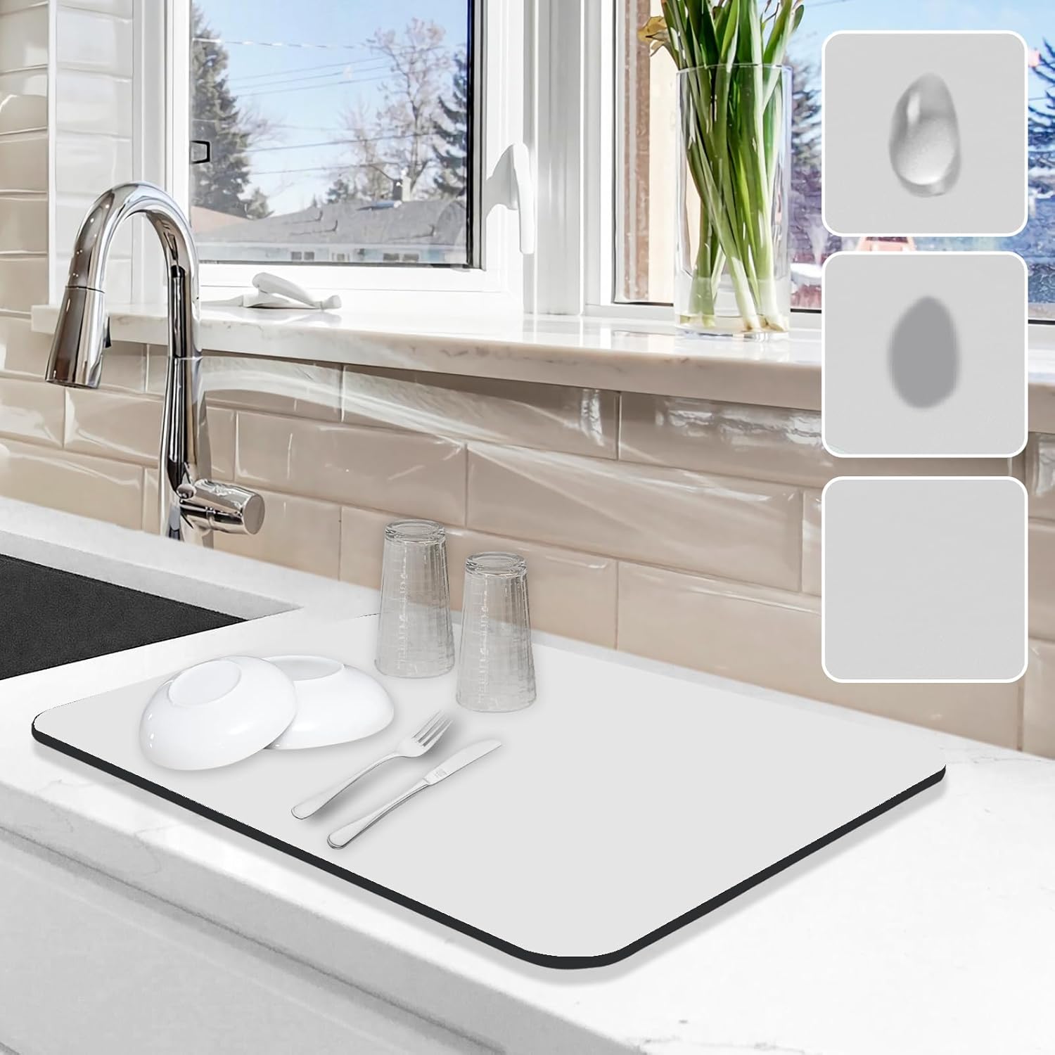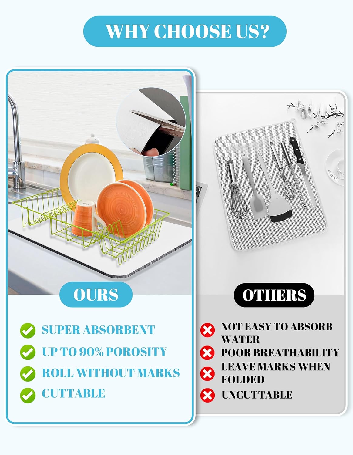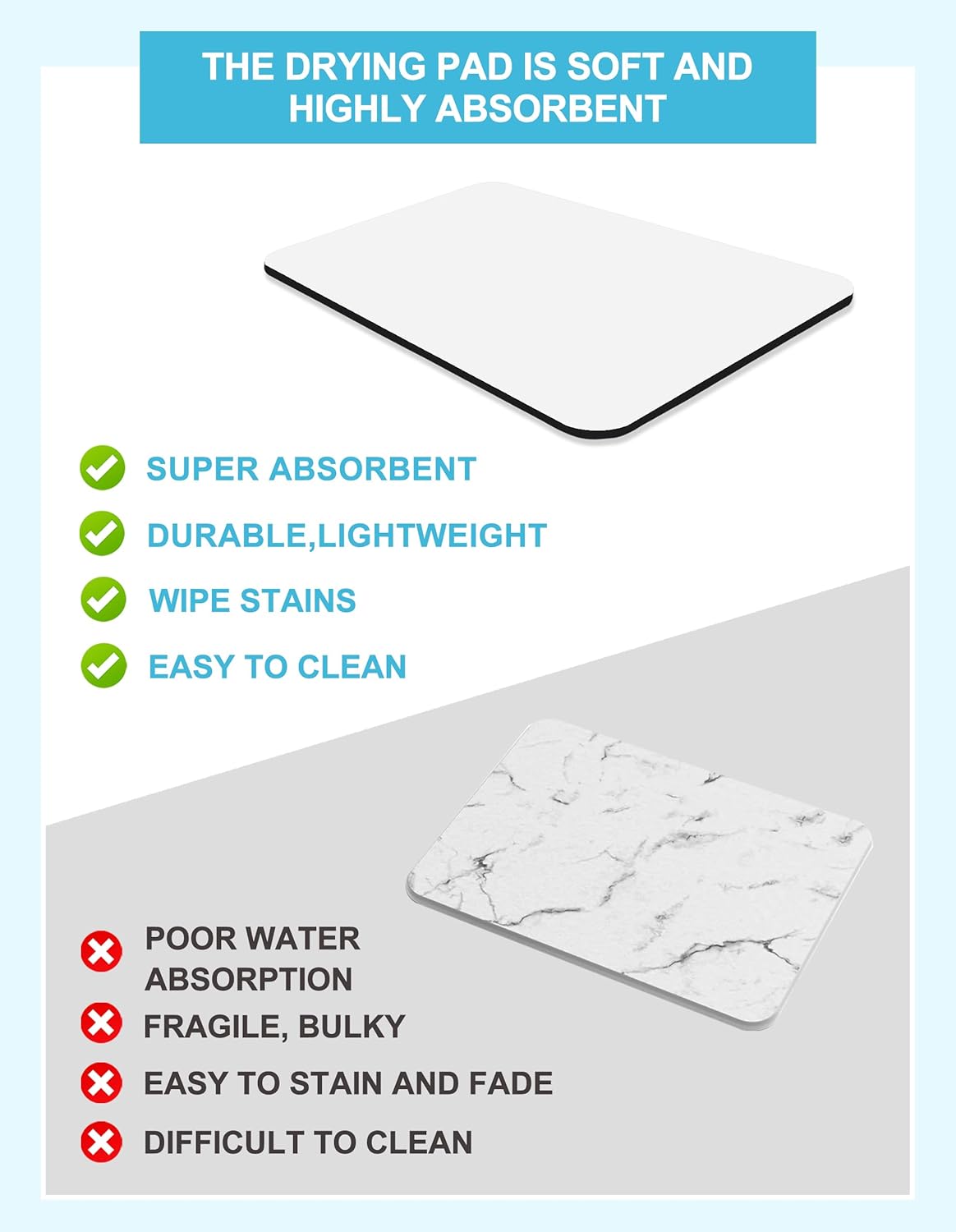 • Super Absorbent: Dish Drying Pad is made of super absorbent nano, the drying pad is soft and highly absorbent, which can dry quickly. In addition, the drying mat is thick enough to better protect countertops, tableware, and glassware from damage and contamination.