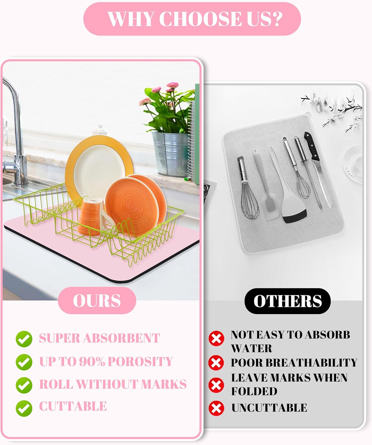 • Super Absorbent: Dish Drying Pad is made of super absorbent nano, the drying pad is soft and highly absorbent, which can dry quickly. In addition, the drying mat is thick enough to better protect countertops, tableware, and glassware from damage and contamination.