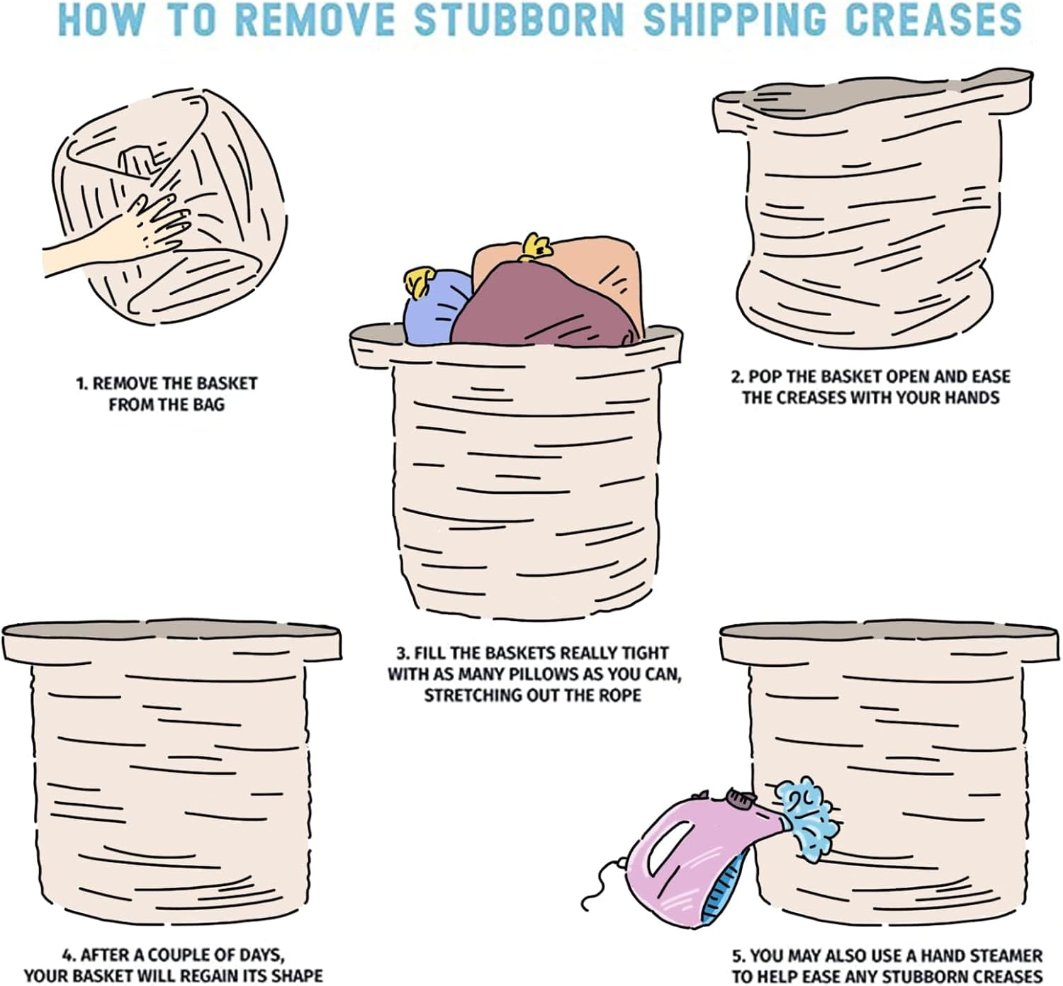 • Washable Large Basket: This large basket can be washed by hand or machine with gentle detergent. If machine washed, please put them into a laundry bag. NOTE: These cotton rope baskets are folded when shipping, but it will turn back to its elegant shape quickly if you fill it with some towels or clothing, and iron is great idea to remove the creases