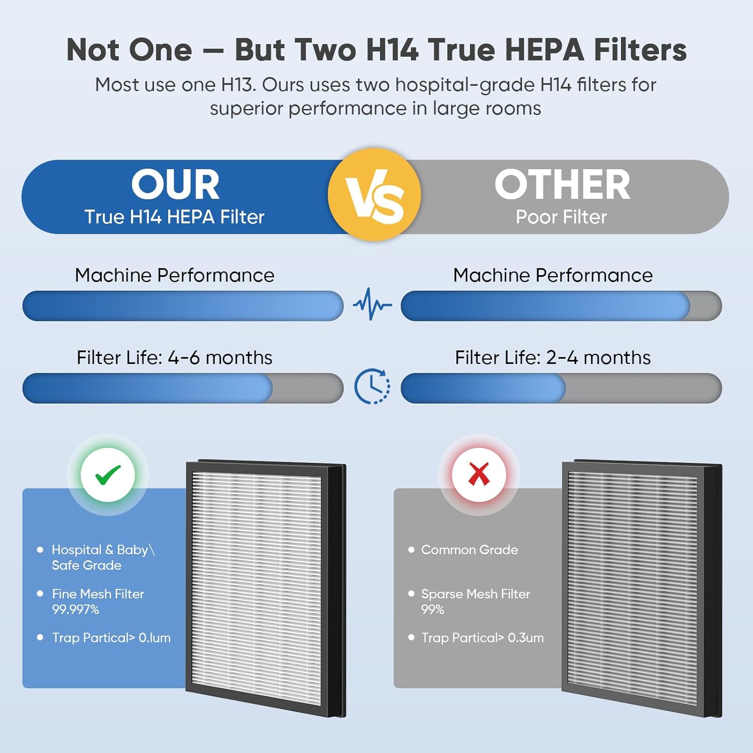 • 【2 x ADVANCED H14 HEPA FILTER]】Discover exceptional air quality with our new air purifiers for home, featuring two advanced H14 HEPA filters that capture 99.997% of particles as small as 0.1 microns—superior to H13 filter. Our Hepa air purifier combines a pre-filter, H14 HEPA filter, activated carbon filter, and net filter to achieve optimal performance. Efficiently removes dust, smoke, pollen, hair, and odors, ensuring you breathe easier and enjoy a fresher, cleaner home environment
