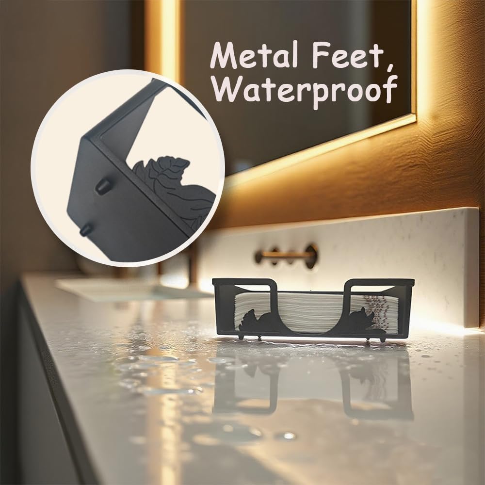 Metal Napkin Holder for Bathroom and Kitchen - Black Floral Design Disposable Hand Towel Holder Tray, Guest Towel Organizer for Countertop, Paper Napkin and Towel Dispenser(Black)