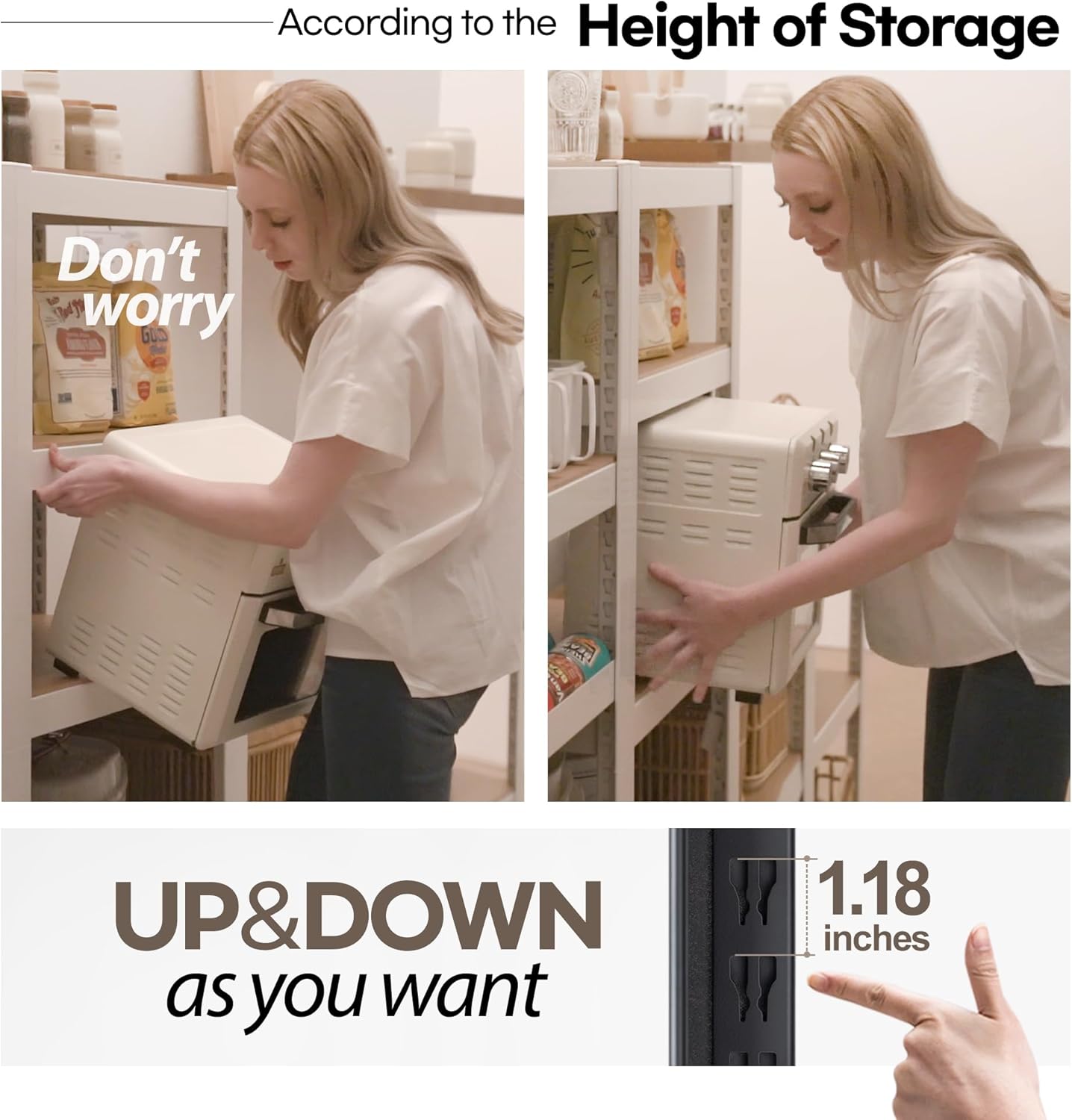 • EASY TO ASSEMBLE & HEIGHT ADJUSTABLE - You don't need any parts as plastic clips like wire shelving. You just slide and fix the frame in the post hole (a Mallet is a giveaway). Once it is put together, it can create a great deal of additional storage space without taking up too much space. Each tier can be freely adjusted the shelf up and down by the size of the item, as the hidden secret holes inside the post have grooves 1.18 inches apart. So can create customized storage space.