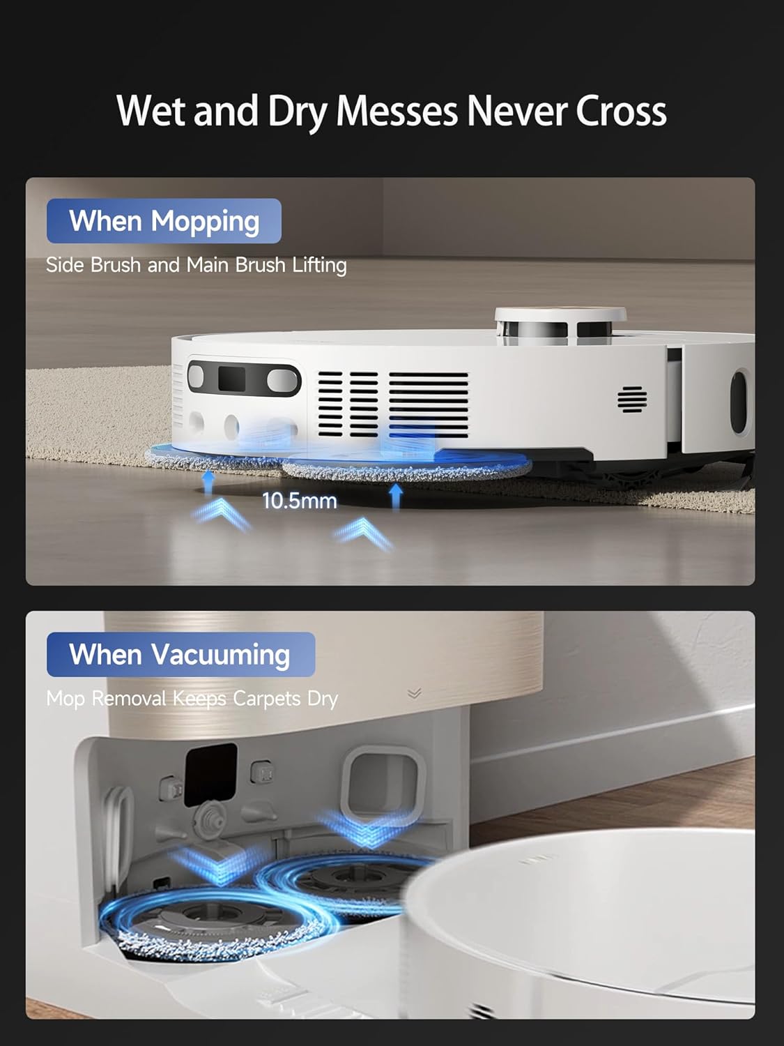 • Keep Carpets Dry with a Removable & Liftable Mop: X40 Ultra protects carpets from moisture by removing mops or auto-lifting them to 10.5mm(0.41inch). Set zones to avoid rugs, reducing the risk of getting stuck.