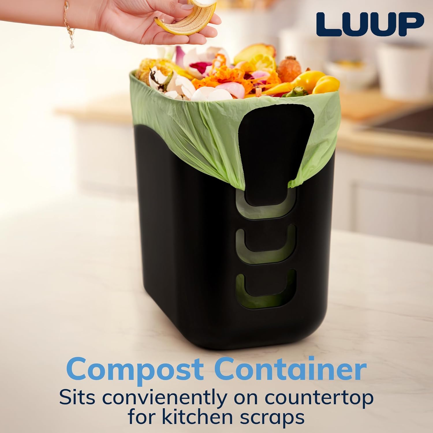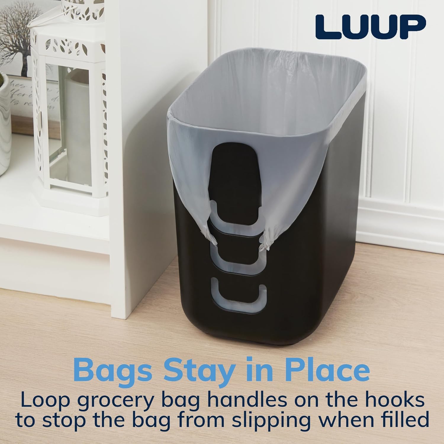 • Patented Smart Bag-Securing Tabs – Features three convenient tabs to hold grocery bag handles in place, preventing liners from slipping inside.