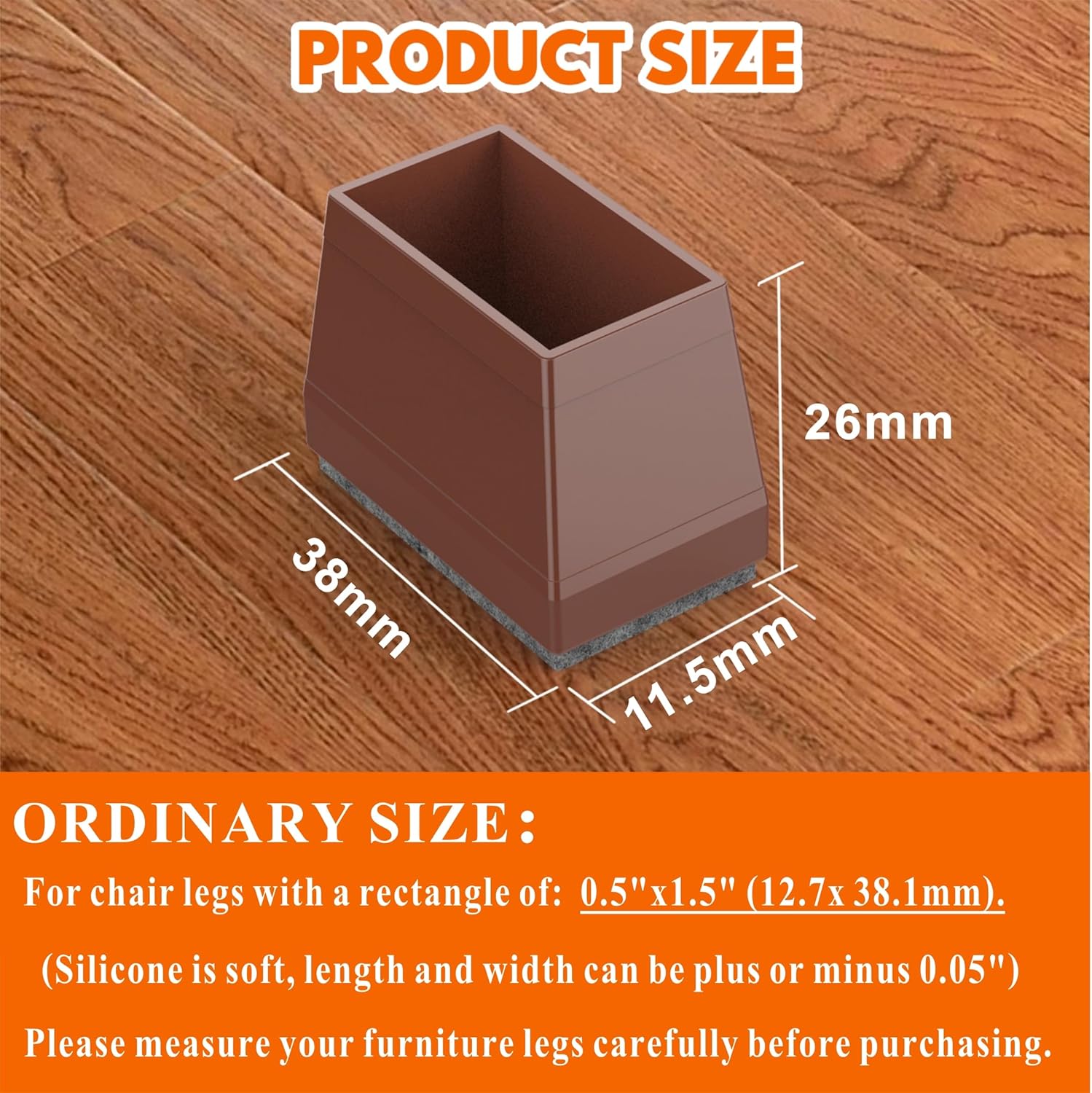 • Universal Fit: Suitable for chair legs with a rectangle of: 0.5"x1.5" (12.7 x 38.1mm).(Silicone is soft, length and width can be plus or minus 0.05") Please measure the diameter of your furniture legs before purchasing. Our chair leg caps are suitable for square furniture foot , such as restaurant chairs, bar stools, patio chairs, kitchen chairs, storage cabinet, metal bistro chairs etc.