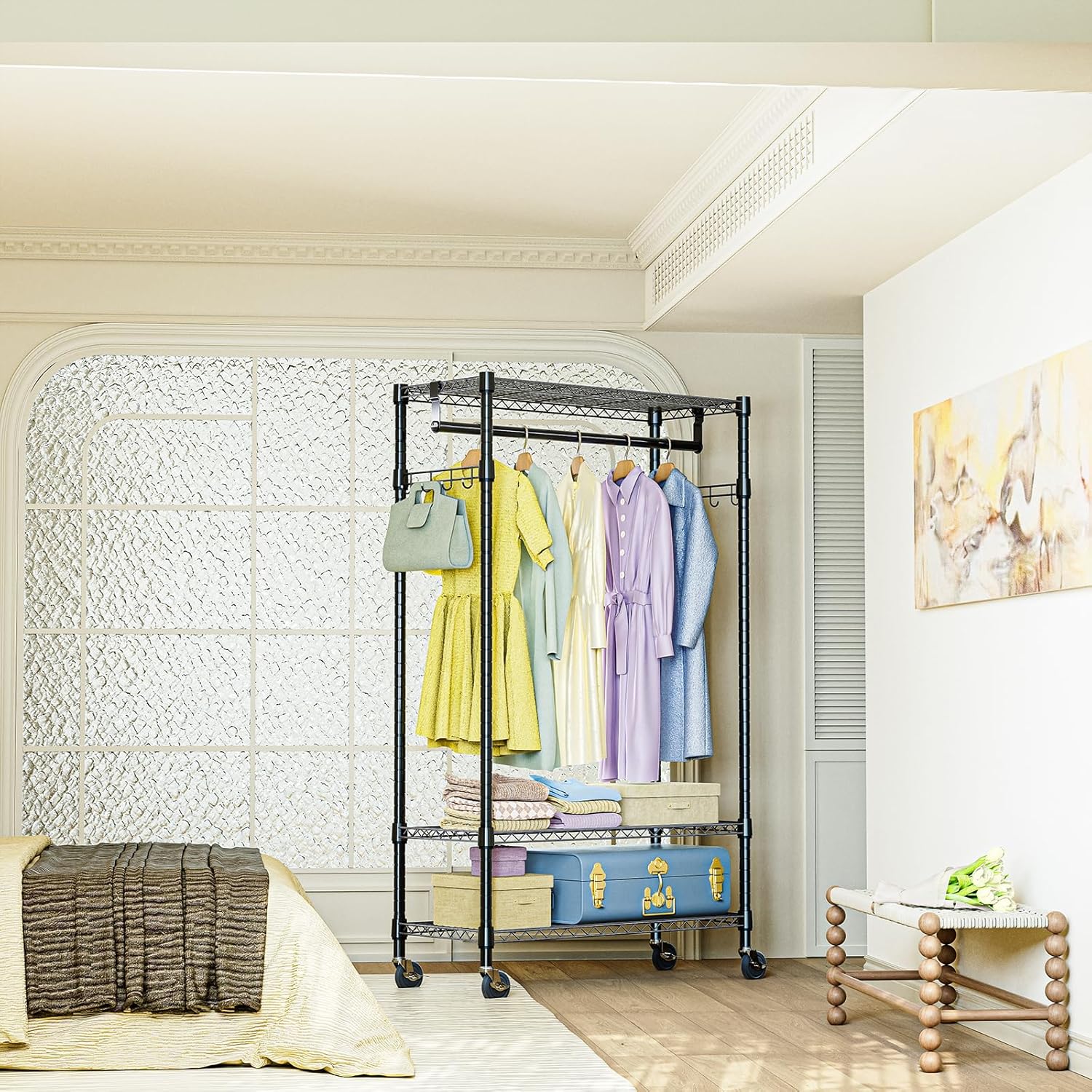 IZEUK Heavy Duty Rolling Garment Rack with 3 Adjustable Wire Shelves, Hanging Rod & Side Hooks - Mobile Clothes Rack with Wheels, 29.5" W x 15.7" D x 75" H, Black