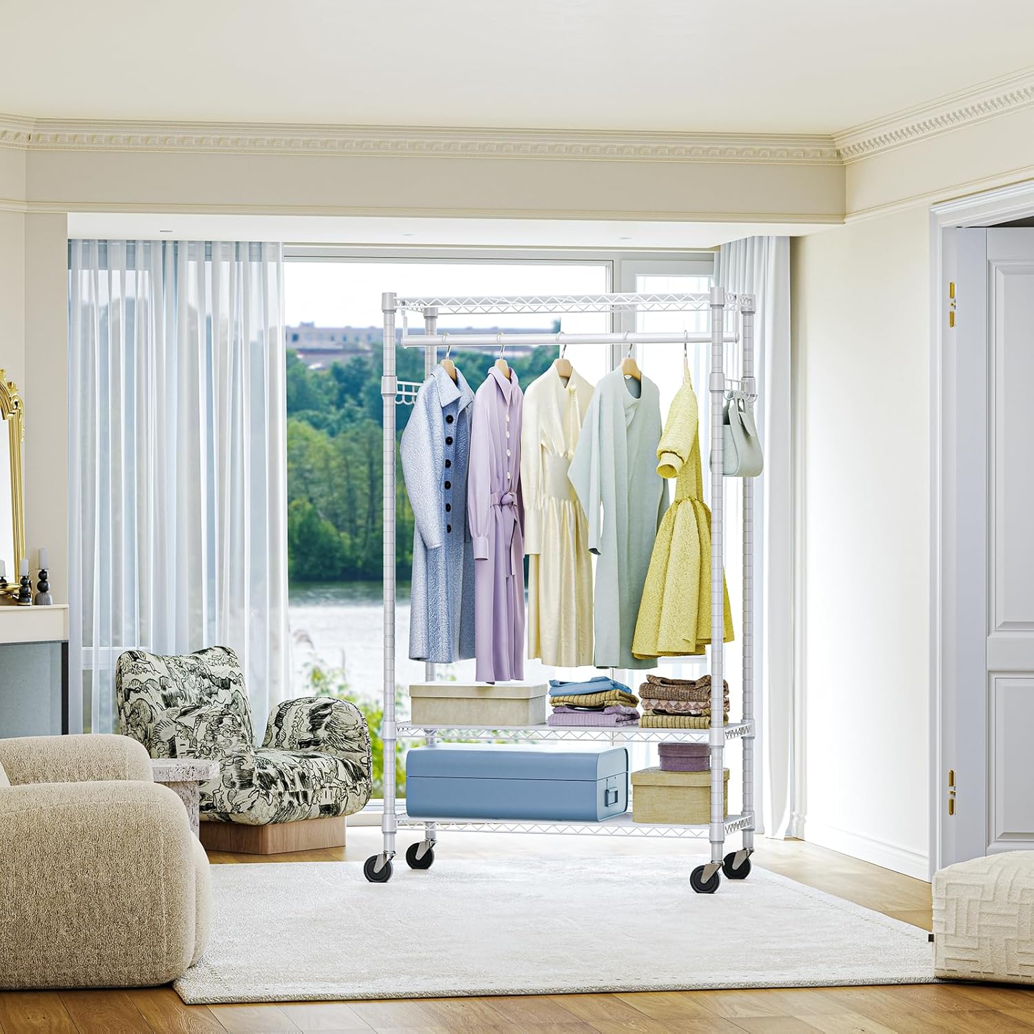 IZEUK Heavy Duty Rolling Garment Rack with 3 Adjustable Wire Shelves, Hanging Rod & Side Hooks - Mobile Clothes Rack with Wheels, 29.5" W x 15.7" D x 75" H, White