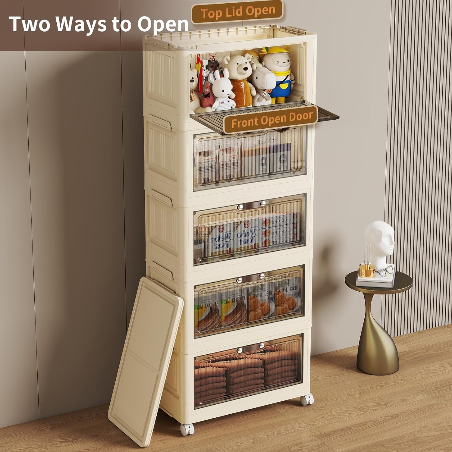 5 Tier - 48QT Storage Bins with Lids, Collapsible Storage Bins with Doors and Wheels, Plastic Storage Cabinet for Easy Storage and Organization for Living Room, Office