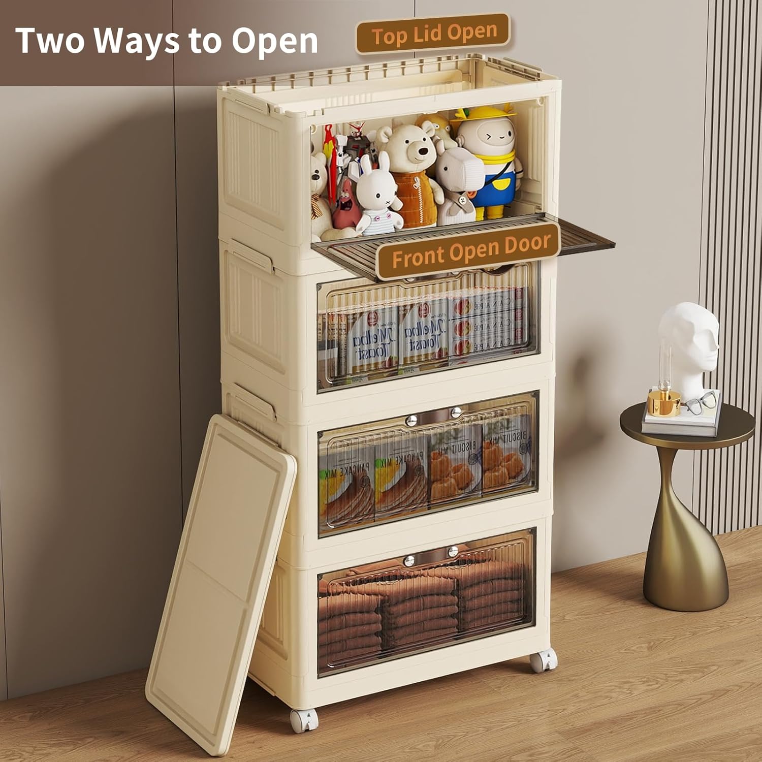 • Two Opening Ways: There are two ways to open the lid storage box. You can open the top cover or open it from the front door. The front cover of each plastic drawer storage is translucent, and you can clearly see the items stored inside, which is a good assistant to our family