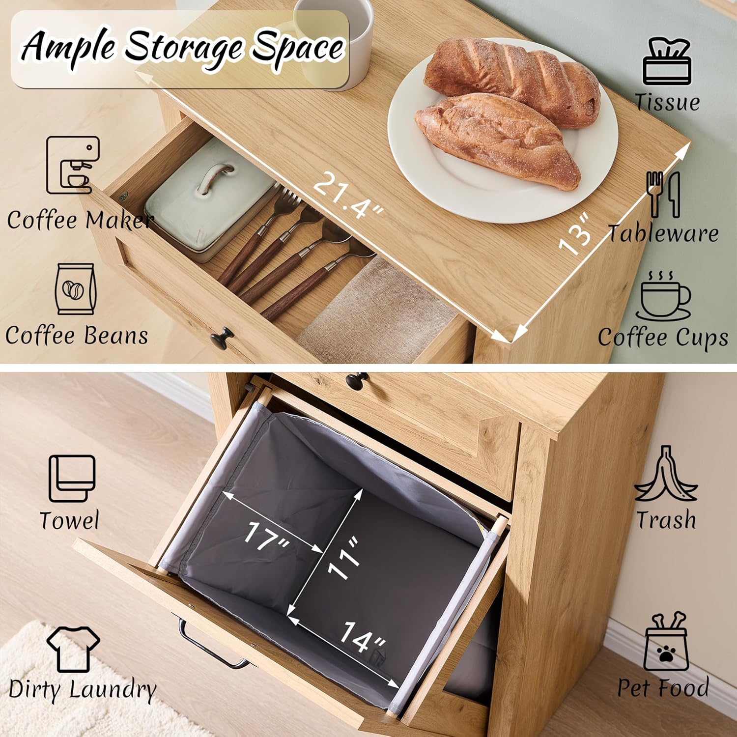Tilt Out Laundry Hamper Cabinet, 10 Gallon Farmhouse Trash Can Cabinet with Drawer, Hidden Wood Garbage Can Bin Cabinets with Laundry Storage Basket for Bathroom, Kitchen, Natural