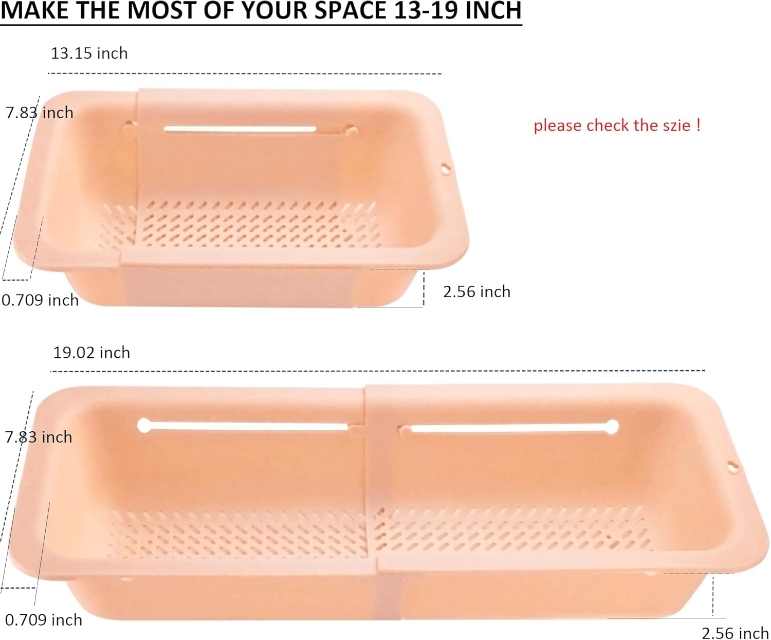 • LASSHSWA Over the sink extendable strainer, SIZE: 13-19 in (smaller space-saving design) . Stainless steel drain strainer, SIZE: Outer diameter: 4.5”; inner filter: 3”; depth: 1” . They fit for most kitchen sinks and drains.