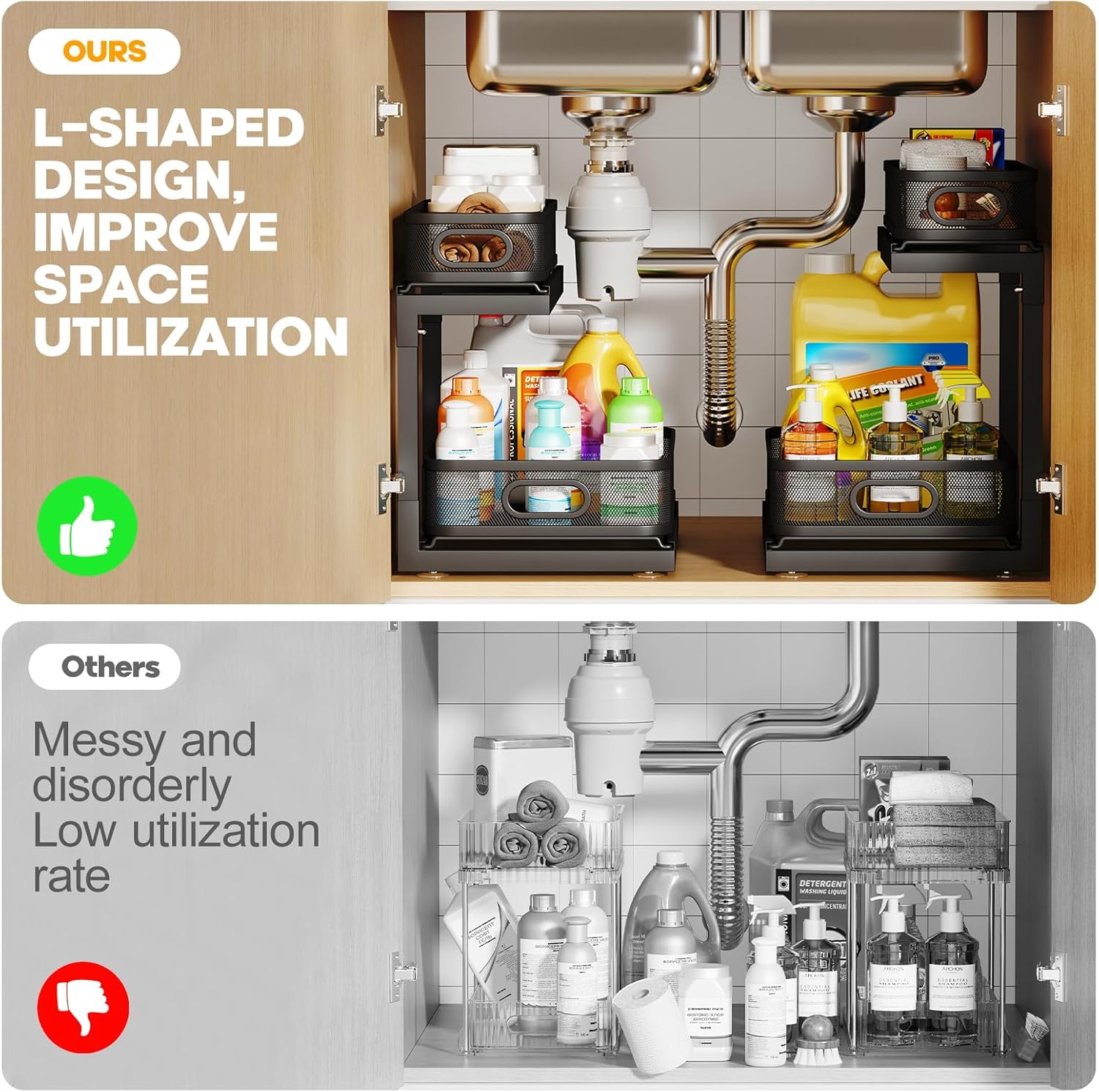 • 【Transform Your Space with Dual Pull-Out Design】 Discover the efficiency of our 2-Pack Under Sink Storage Organizer! Featuring an innovative dual pull-out design, both tiers glide open for quick and easy access to your essentials. Whether you’re organizing cleaning supplies or personal care items, the 2-Tier Slide Out Drawer helps maintain a neat and tidy home, making your daily routine more manageable.