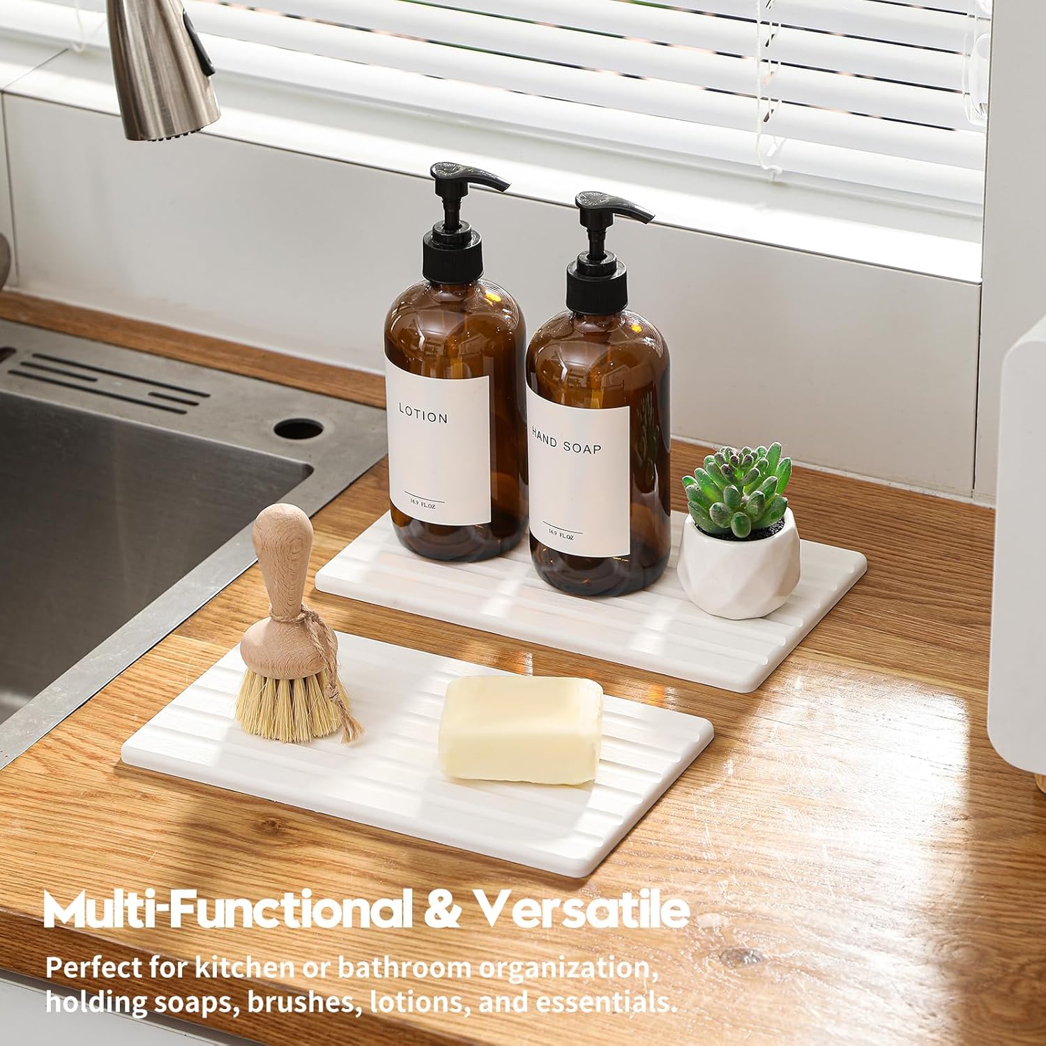 • 【Multifunctional】 Using this instant drying water absorbing tray for your soaps and brushes in the bathroom counter, or by the kitchen sink. The drying stone sink caddy provides you with a neat and orderly space for your home, organizing the hand soap dish, bar coasters, dish washing sponges, makeup bottles coasters, cosmetic bottles soap bottles perfectly